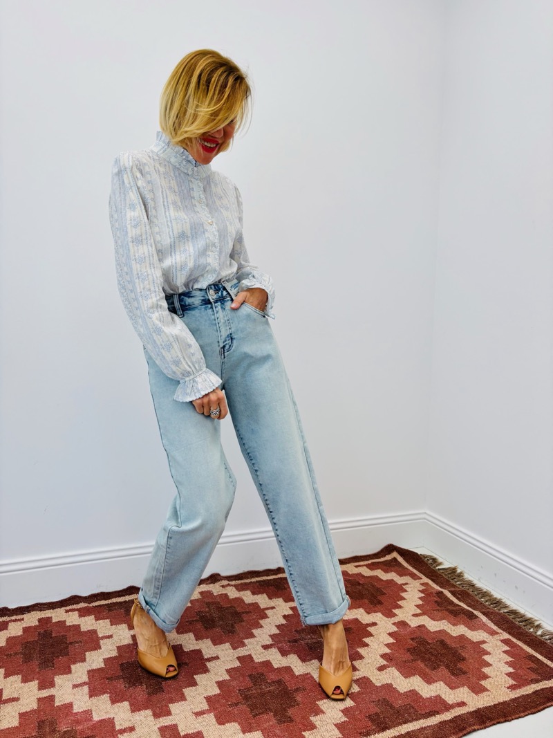 Cette chemise se porte parfaitement avec un jean clair taille haute pour une silhouette lumineuse et féminine. Associée à un denim droit ou mom fit, elle crée un look équilibré entre romantisme et modernité.