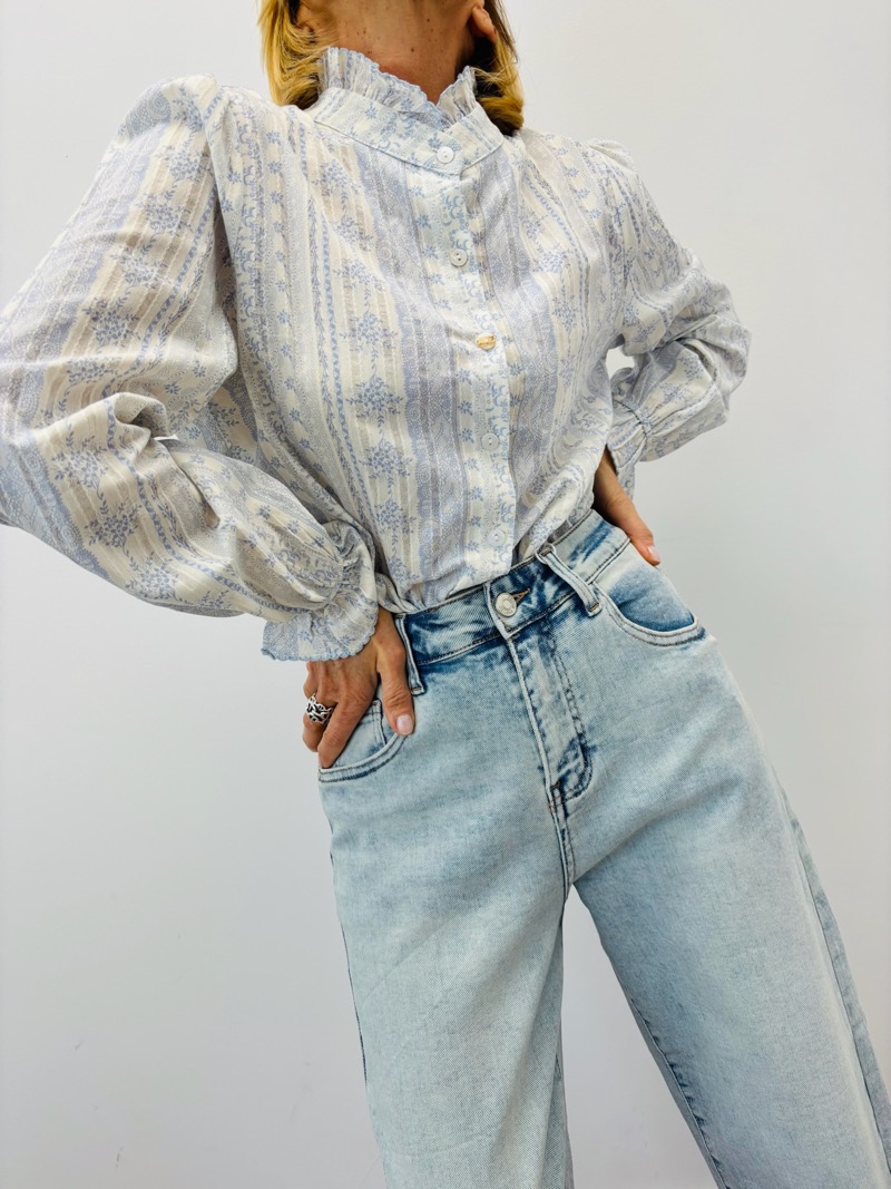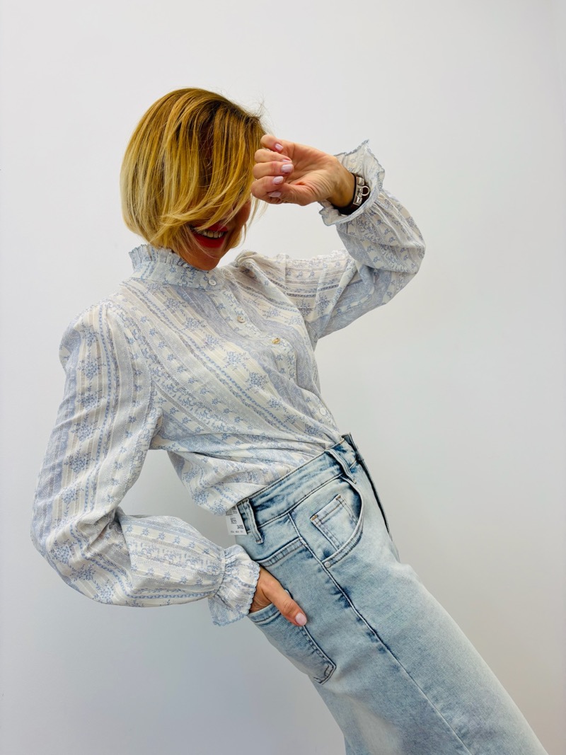 Élégante et délicatement travaillée, cette chemise col victorien en 100% coton incarne parfaitement l’esprit romantique chic. Son imprimé bleu aux inspirations florales et ornementales apporte fraîcheur et raffinement tout en restant facile à associer.