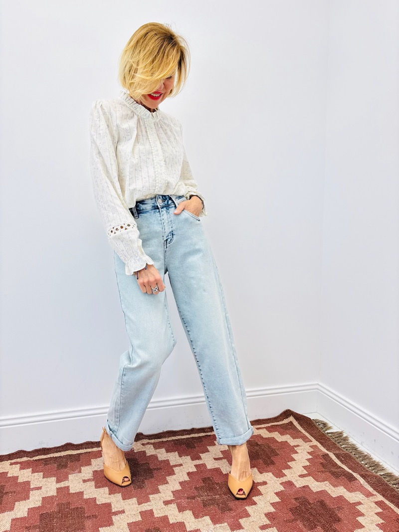 Cette chemise se porte parfaitement avec un jean clair taille haute pour une silhouette lumineuse et féminine. Associée à un pantalon beige ou blanc, elle crée un look doux et élégant.