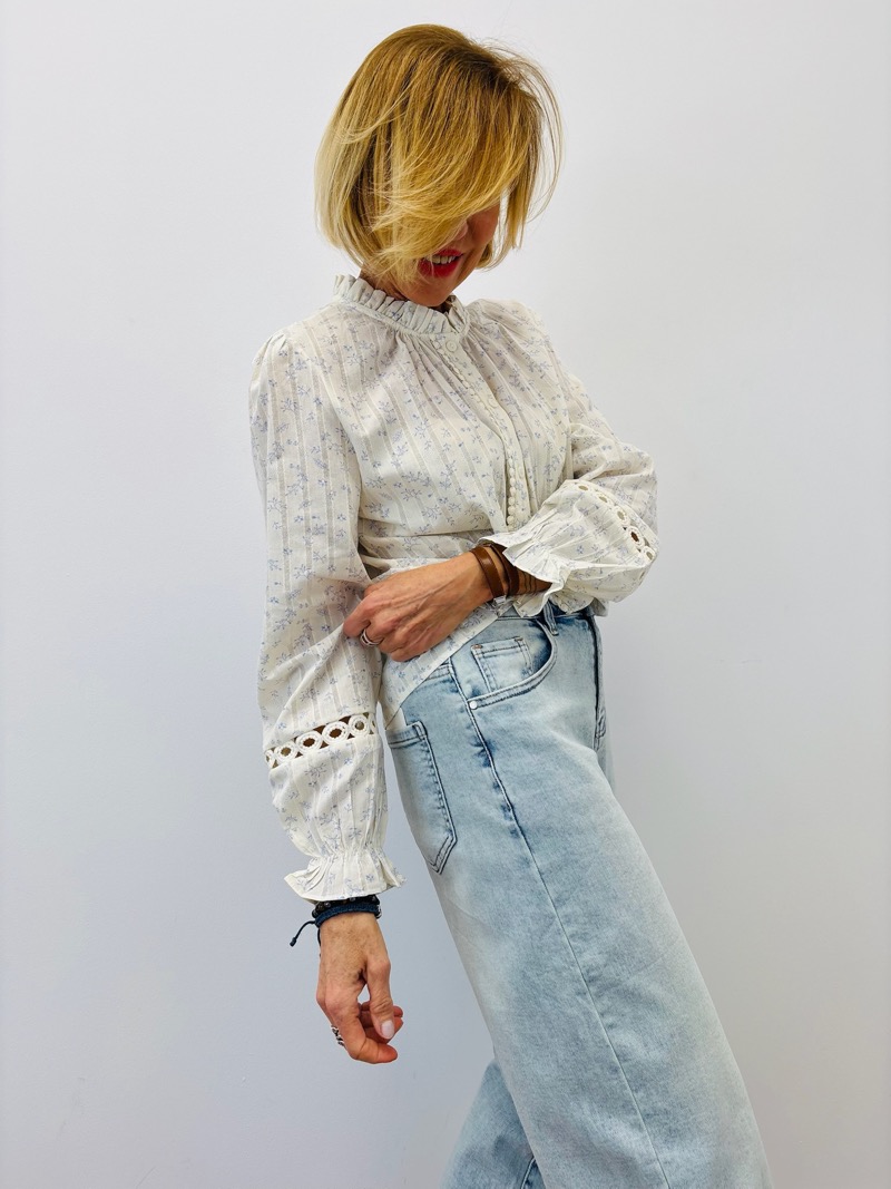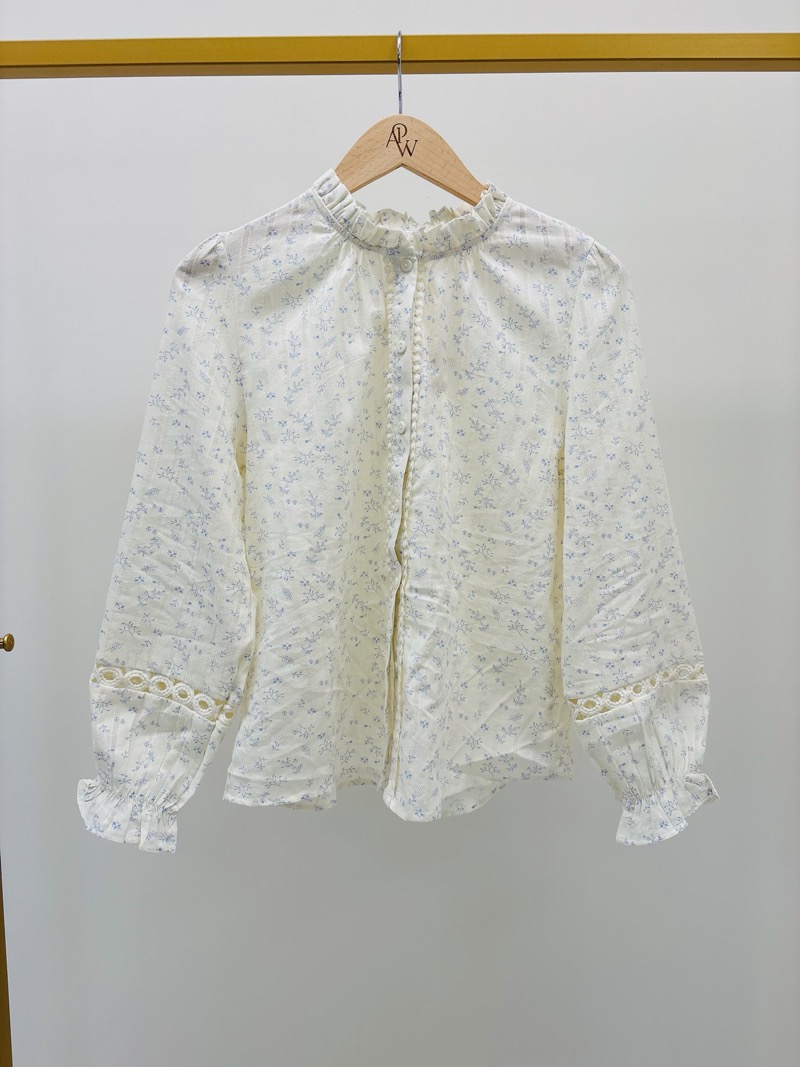 Le col victorien légèrement volanté encadre le visage avec raffinement et donne immédiatement du caractère à la silhouette. La patte de boutonnage agrémentée de petits détails subtils renforce son charme féminin. Les manches longues légèrement bouffantes, resserrées aux poignets avec finition volantée, apportent volume et modernité.