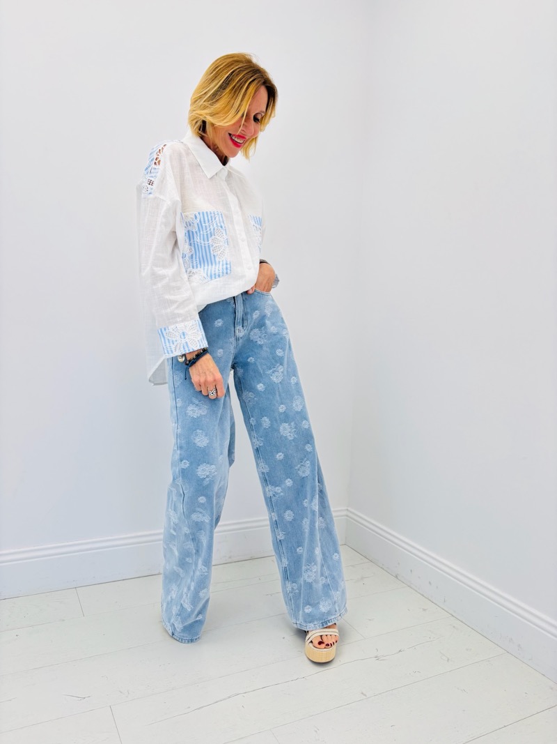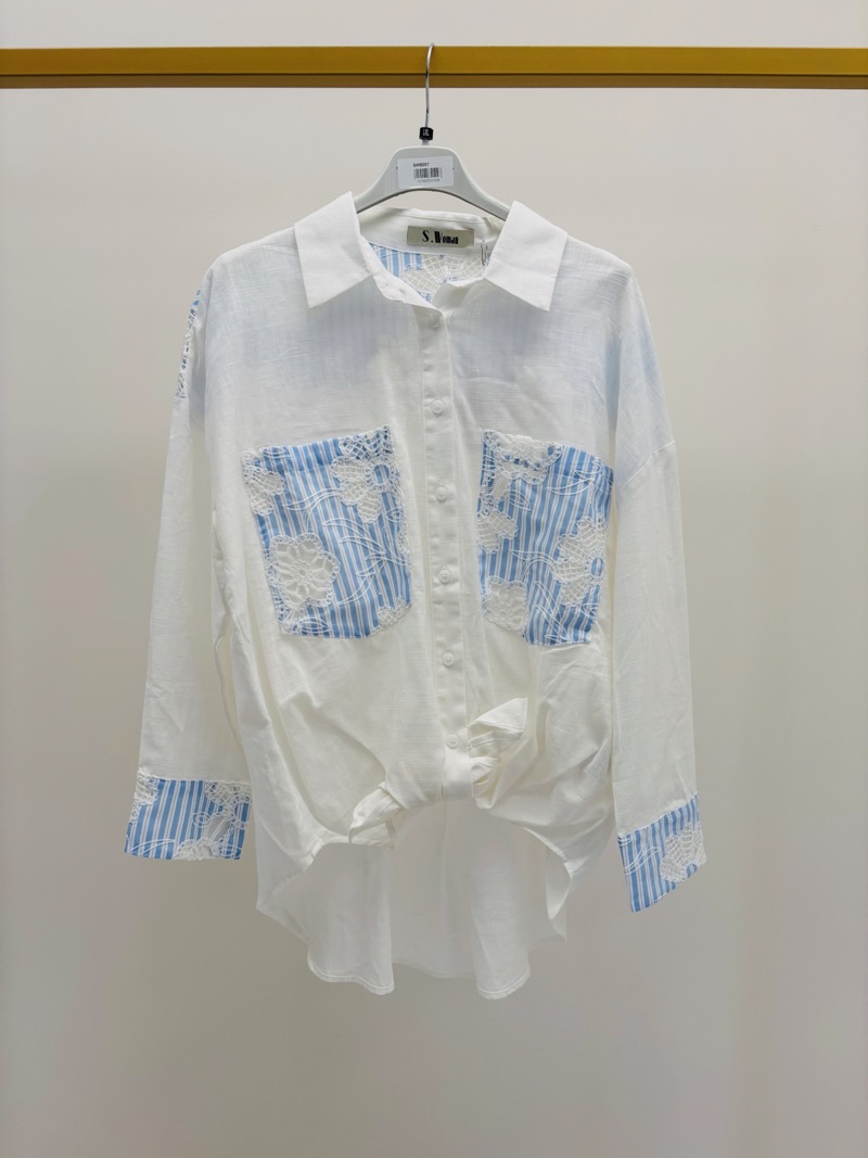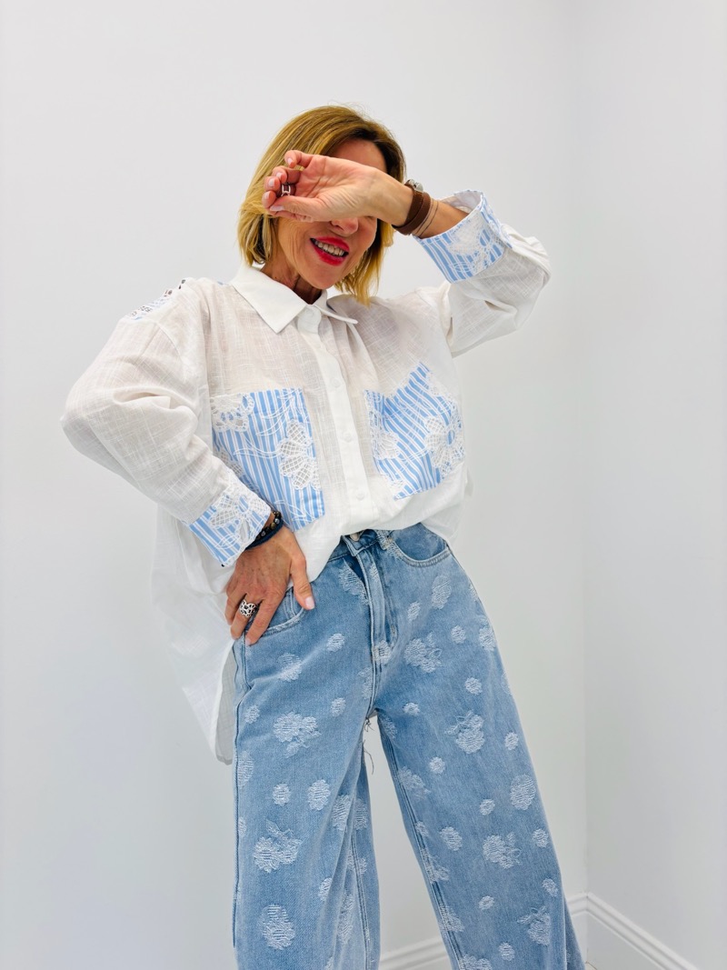 Les poches poitrine et les poignets sont sublimés par des empiècements rayés bleu clair agrémentés de broderies florales délicates, créant un contraste subtil avec la base blanche de la chemise. Ces détails apportent une touche artisanale et tendance qui distingue cette pièce des chemises classiques.