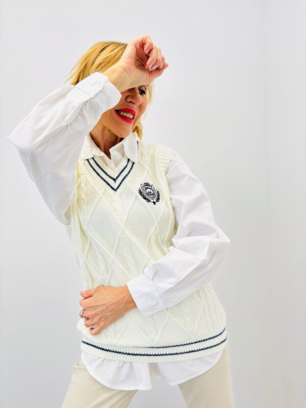 La coupe courte modernise la chemise classique et met en valeur la taille, tandis que le détail de dentelle délicate au bas ajoute une touche féminine et raffinée. Les manches longues, travaillées avec des empiècements contrastés, renforcent l’originalité de la pièce et font de cette chemise un véritable élément mode.