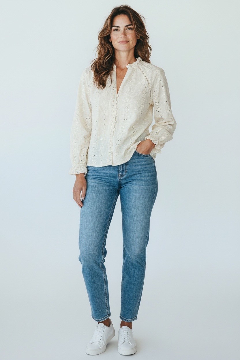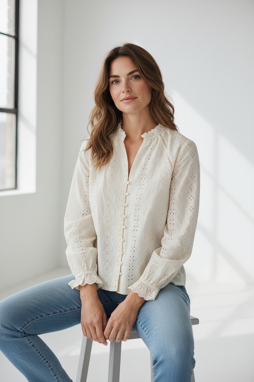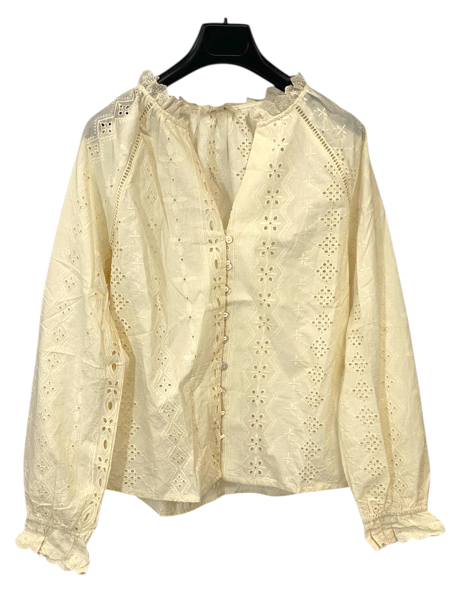 La broderie anglaise, finement travaillée sur l’ensemble de la pièce, apporte relief et délicatesse tout en laissant subtilement passer la lumière. Les motifs ajourés créent un jeu de transparence élégant, sans jamais être excessif. Le col légèrement froncé et l’encolure boutonnée offrent une allure romantique et raffinée, tandis que les manches longues, resserrées aux poignets avec une finition volantée, renforcent le charme de cette pièce.