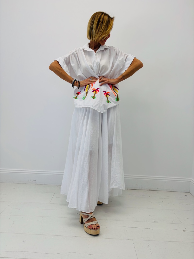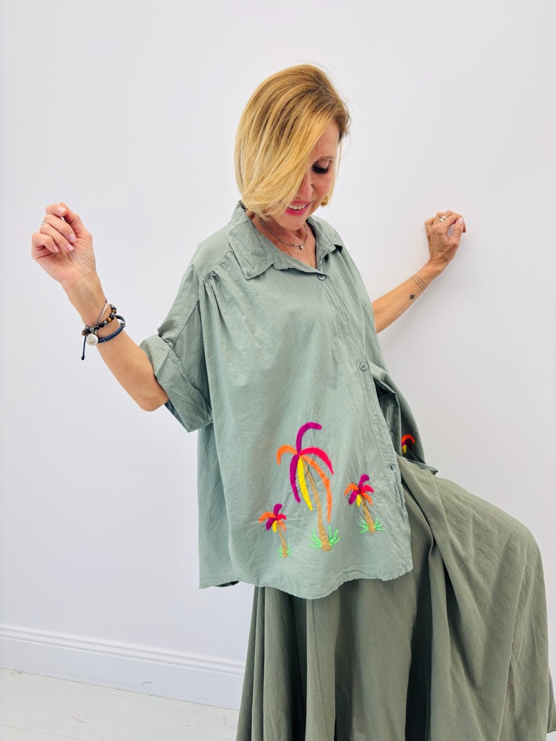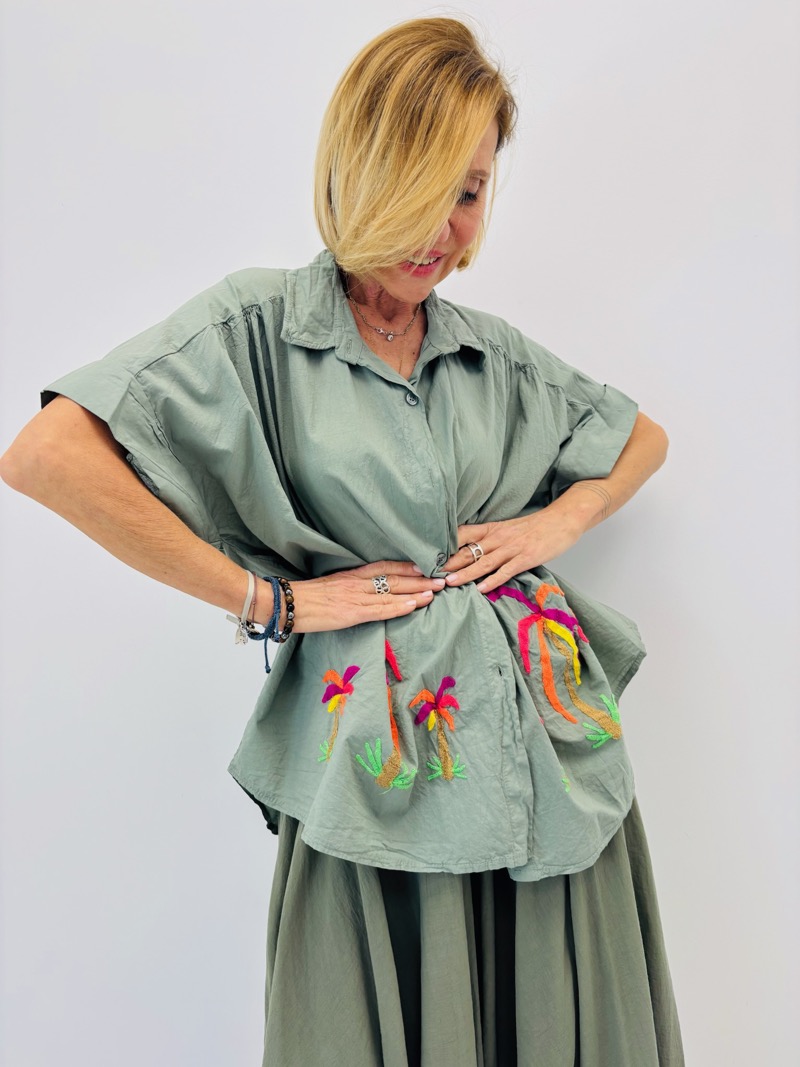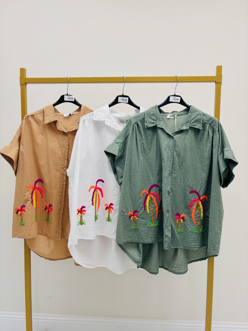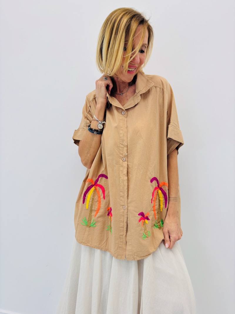 Son design se distingue par de délicates broderies de palmiers multicolores, qui apportent une note tropicale et solaire tout en restant élégantes. Ces broderies placées sur le bas de la chemise créent un effet visuel original et donnent immédiatement du caractère à la pièce.