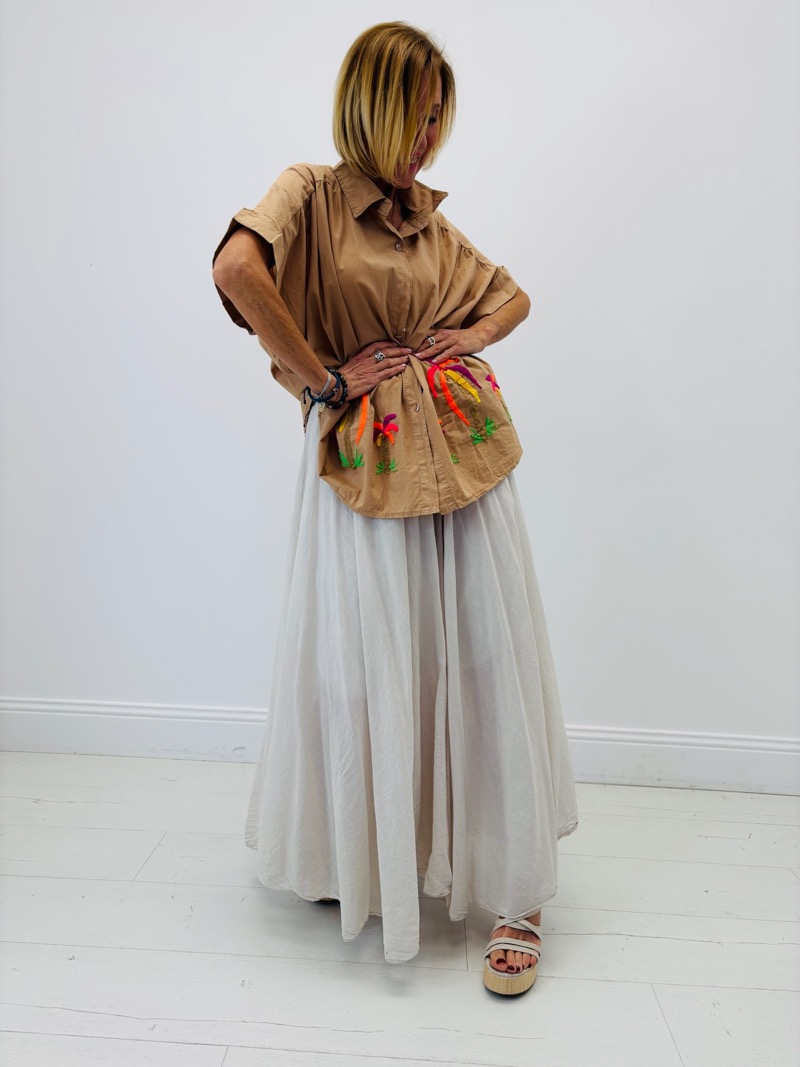 Portée avec une jupe longue fluide, un pantalon en lin ou un jean clair, cette chemise crée un look estival à la fois décontracté et élégant. Les broderies colorées apportent immédiatement du relief à la tenue et permettent de composer des silhouettes lumineuses et originales. Associée à des sandales naturelles ou des accessoires bohèmes, elle devient une pièce forte parfaite pour un style vacances chic ou une allure casual sophistiquée.