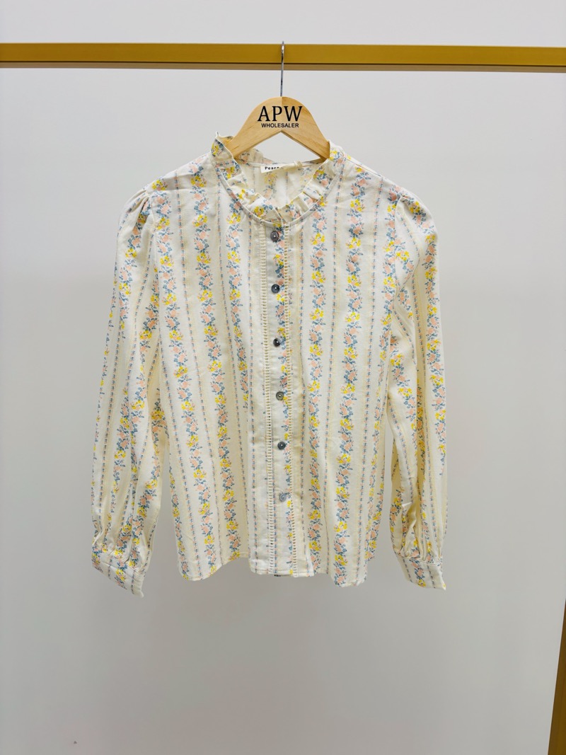 Cette chemise en coton imprimé est une pièce délicate et féminine, idéale pour enrichir une collection prêt-à-porter à l’esprit romantique et intemporel. Son motif associant rayures fines verticales et petites fleurs délicatement colorées apporte une élégance subtile, facile à porter au quotidien tout en restant raffinée.