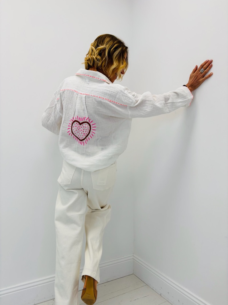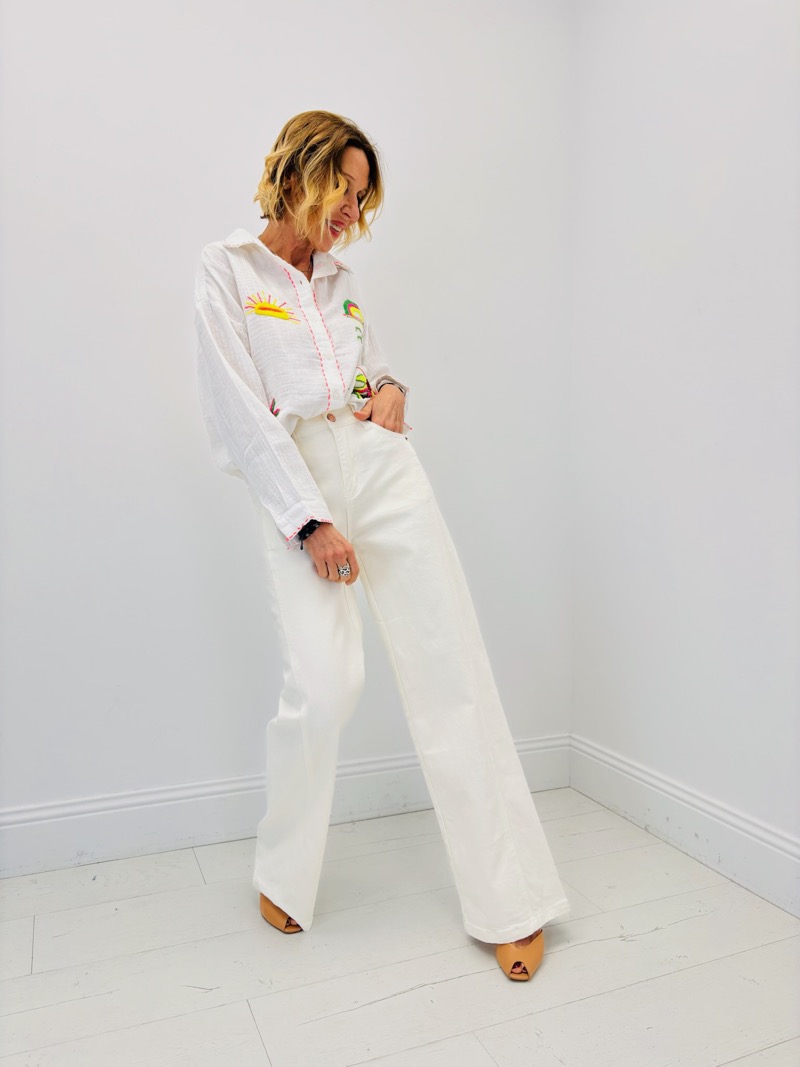 Son design unique se distingue par de magnifiques broderies graphiques représentant des éléments estivaux tels que le soleil, un arc-en-ciel, des palmiers et des étoiles. Ces détails brodés apportent une touche artistique et joyeuse qui transforme cette chemise en véritable pièce coup de cœur.