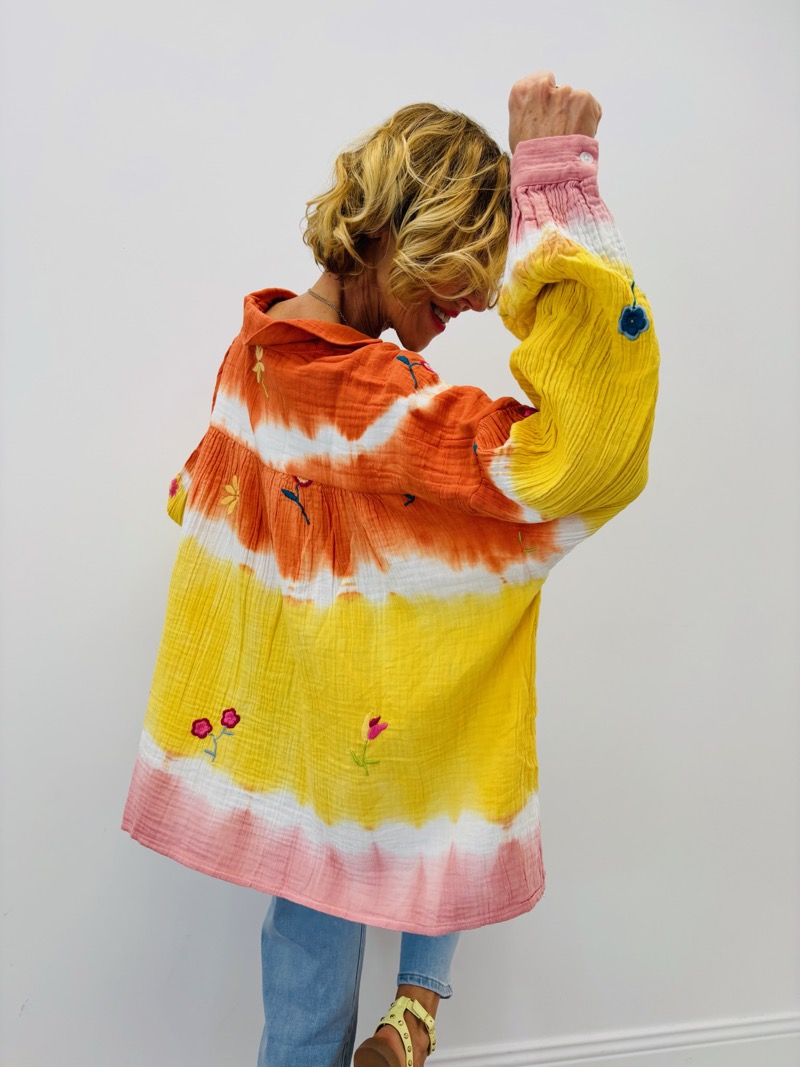 Les délicates broderies florales colorées disséminées sur l’ensemble du modèle ajoutent une touche artisanale et différenciante. Elles viennent enrichir le tie & dye avec subtilité, créant une pièce à forte valeur perçue. Sa coupe ample et fluide permet un tombé naturel, facile à porter ouverte sur un top ou fermée façon blouse.