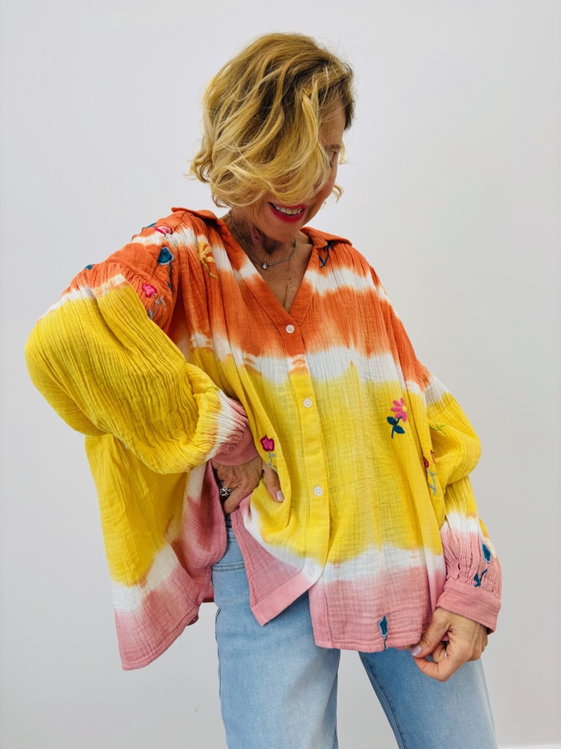 Pièce vibrante et lumineuse, cette chemise en gaze de coton tie & dye incarne parfaitement l’esprit estival et bohème chic. Son dégradé chaleureux mêlant orange solaire, jaune lumineux et rose poudré crée un effet visuel fort, immédiatement attractif en vitrine.