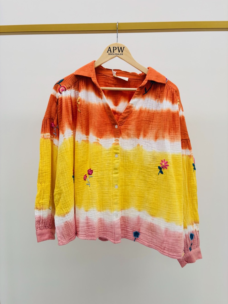 En boutique, cette chemise attire immédiatement le regard grâce à son dégradé solaire et ses broderies. Une pièce forte idéale pour enrichir une capsule été et stimuler les ventes complémentaires avec des basiques denim ou des accessoires naturels.