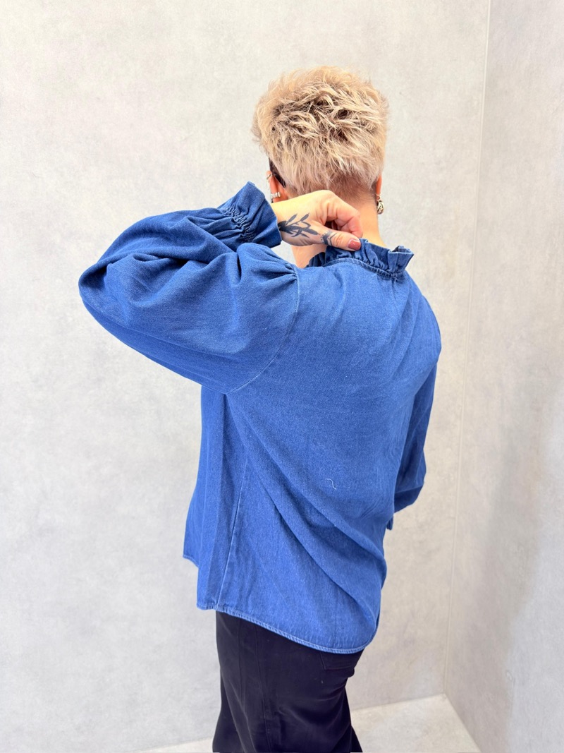 Le col délicatement volanté apporte une touche romantique et féminine qui adoucit l’esprit du jean. La fermeture boutonnée sur le devant permet un porté modulable, ouvert ou fermé selon le style recherché. Les manches longues se terminent par des poignets légèrement froncés, ajoutant du volume et du caractère à la pièce sans alourdir l’ensemble.