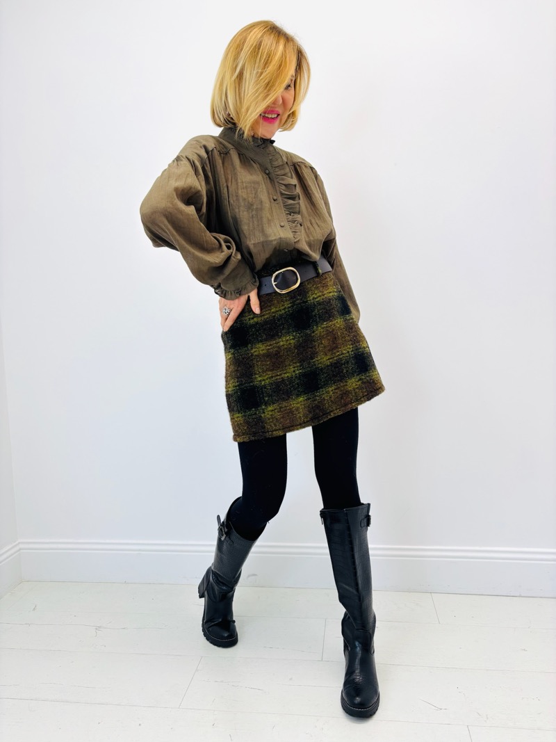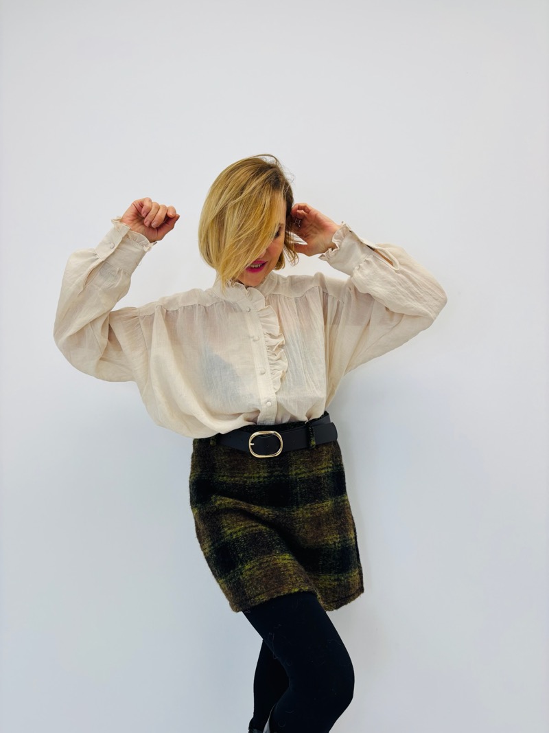Portée avec une jupe taille haute ou un pantalon ajusté, cette chemise crée une silhouette élégante et féminine. Elle s’associe parfaitement à une ceinture pour marquer la taille ou se glisse sous une veste ou un blazer pour un look plus structuré. Avec des bottes ou des bottines, elle devient une pièce idéale pour une tenue chic du quotidien comme pour une allure plus habillée.