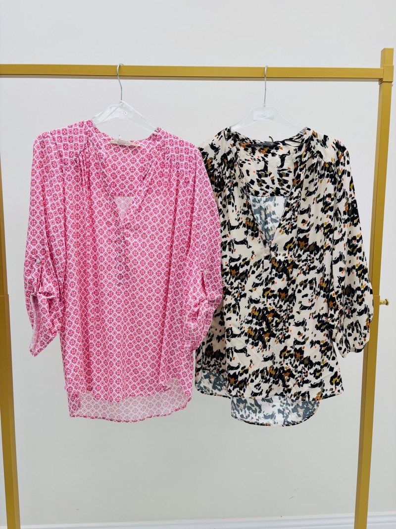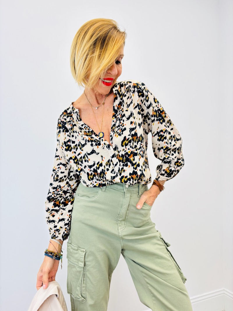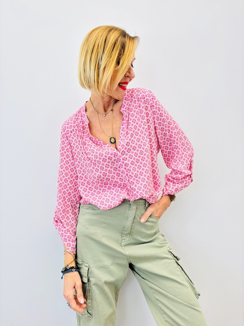 Associée à un pantalon cargo vert ou à un jean taille haute, elle crée un look casual chic équilibré. La version imprimé noir/beige apporte modernité et caractère, tandis que la version rose illumine instantanément une silhouette printanière.