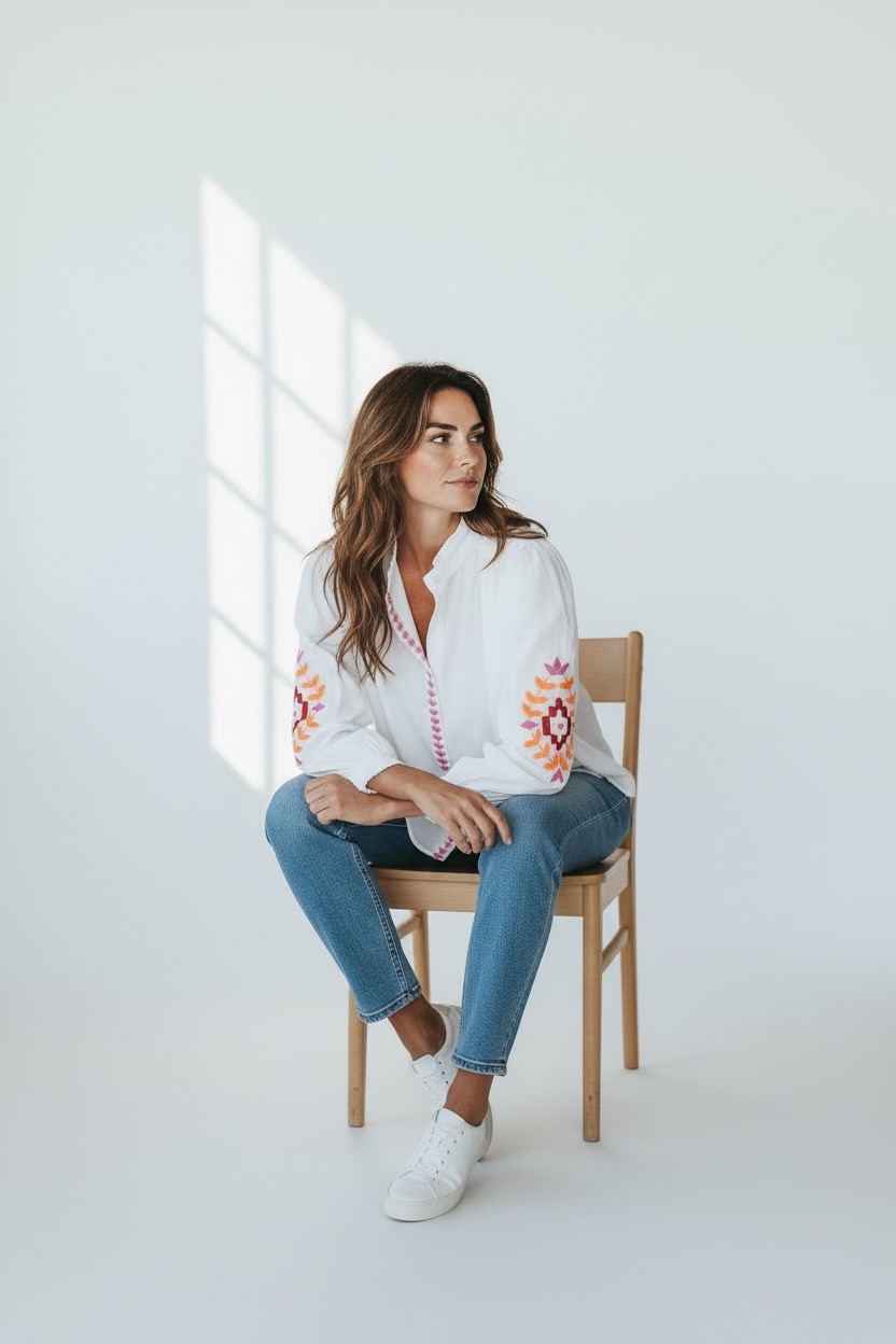 Portée avec un pantalon taille haute ou une jupe fluide, cette chemise apporte immédiatement une touche élégante et raffinée à la silhouette. Elle peut se porter rentrée pour structurer le look ou plus loose pour un esprit bohème chic. Une pièce idéale pour composer des tenues lumineuses, féminines et faciles à valoriser en boutique et en vitrine.