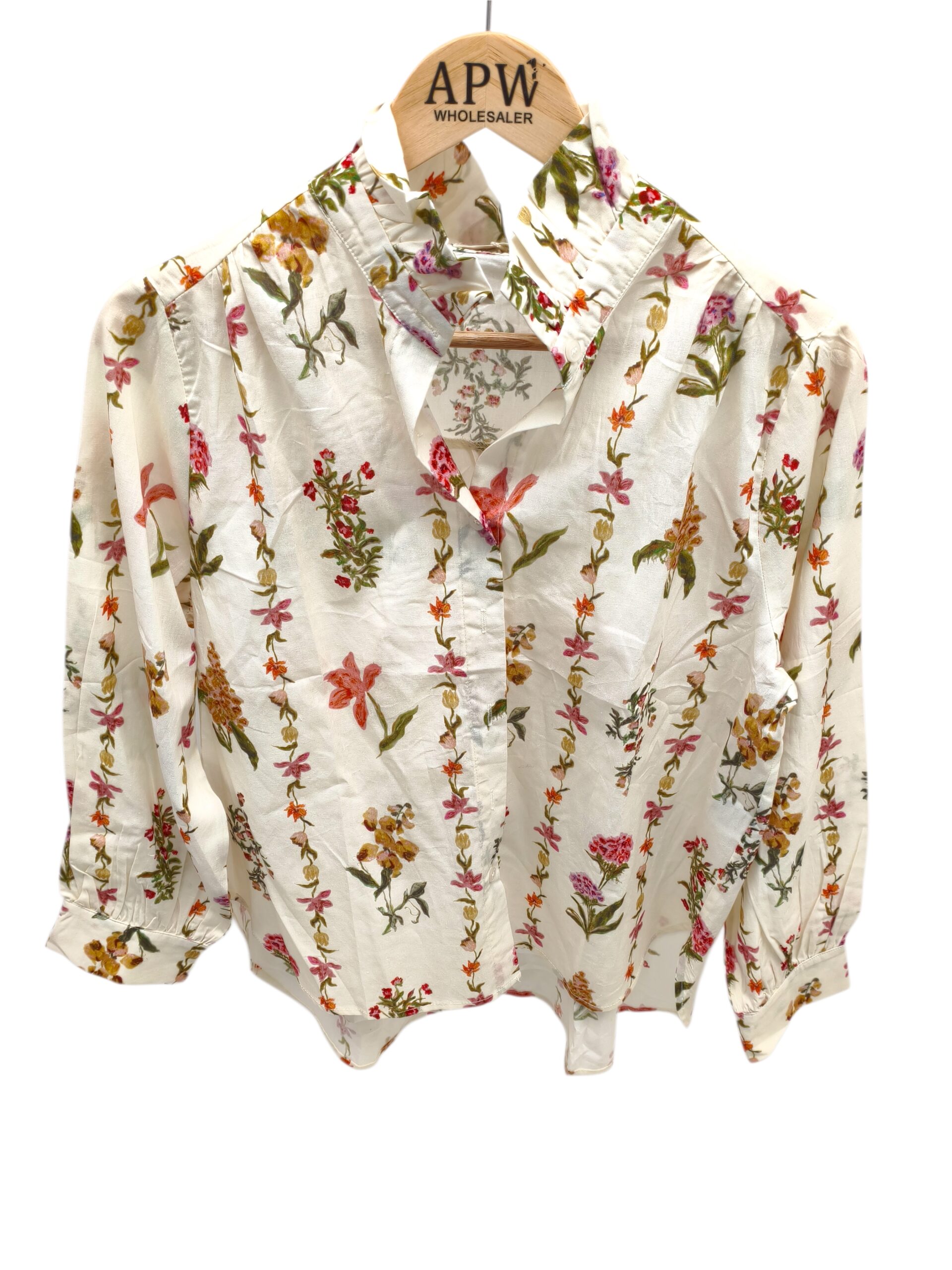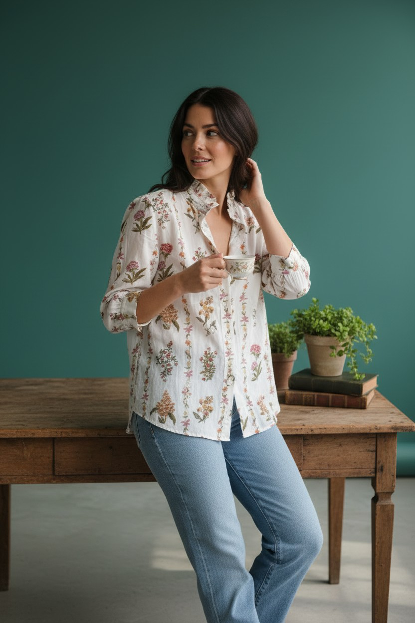 Son imprimé floral délicat, aux nuances douces et harmonieuses, apporte fraîcheur et féminité sans être trop marqué. Le motif all-over, finement travaillé, évoque un style romantique et naturel très recherché. Le col souple subtilement structuré et la patte de boutonnage discrète équilibrent parfaitement l’ensemble pour un rendu chic et facile à porter.