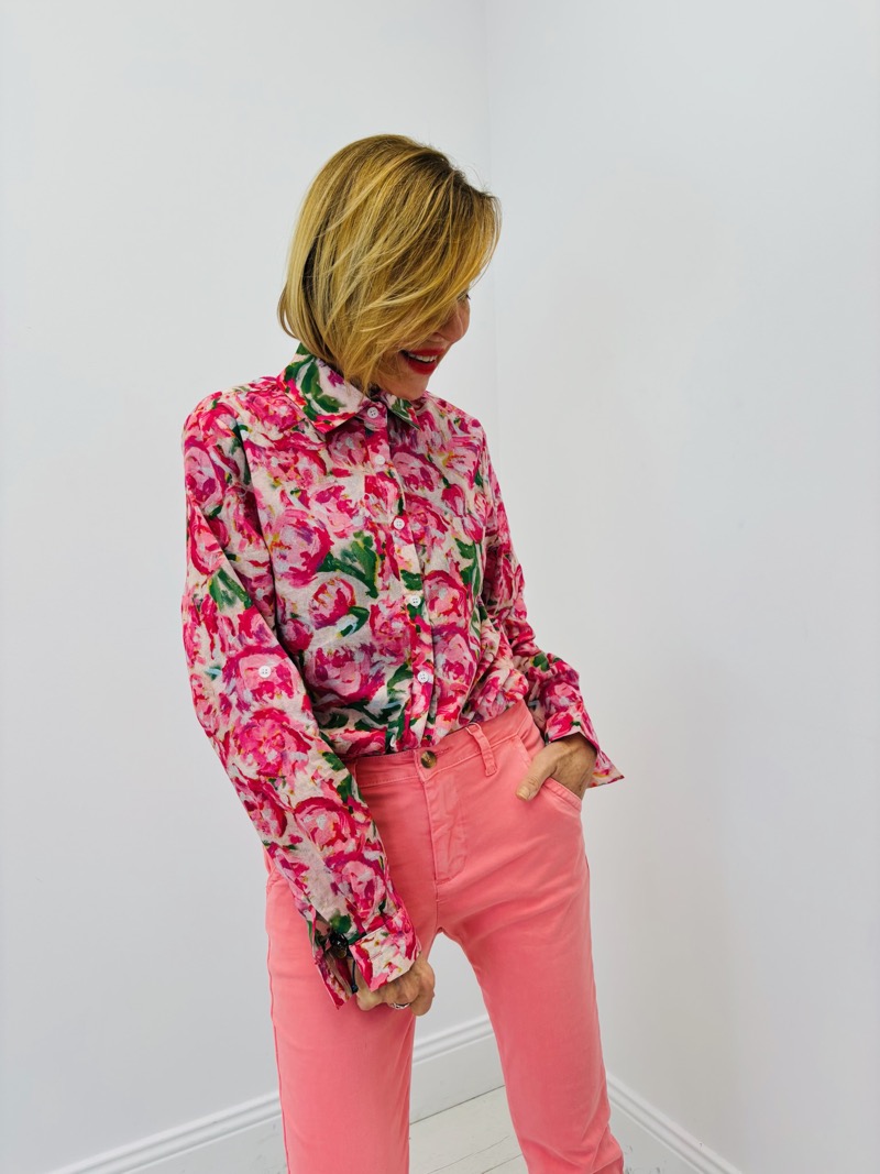 Cette chemise florale en 100 % coton est une pièce lumineuse et pleine de fraîcheur, idéale pour dynamiser une silhouette avec élégance. Son imprimé floral aux nuances de rose, fuchsia et vert apporte une touche artistique et joyeuse, parfaite pour la saison printemps-été comme pour illuminer un look de mi-saison.