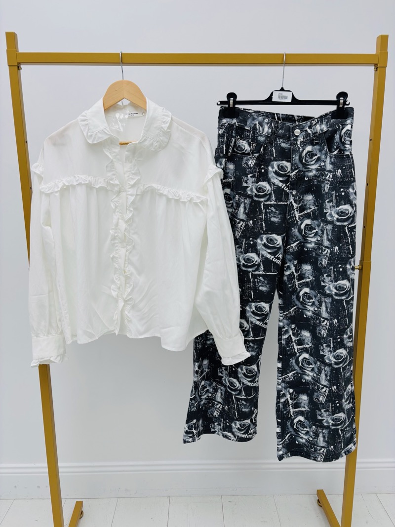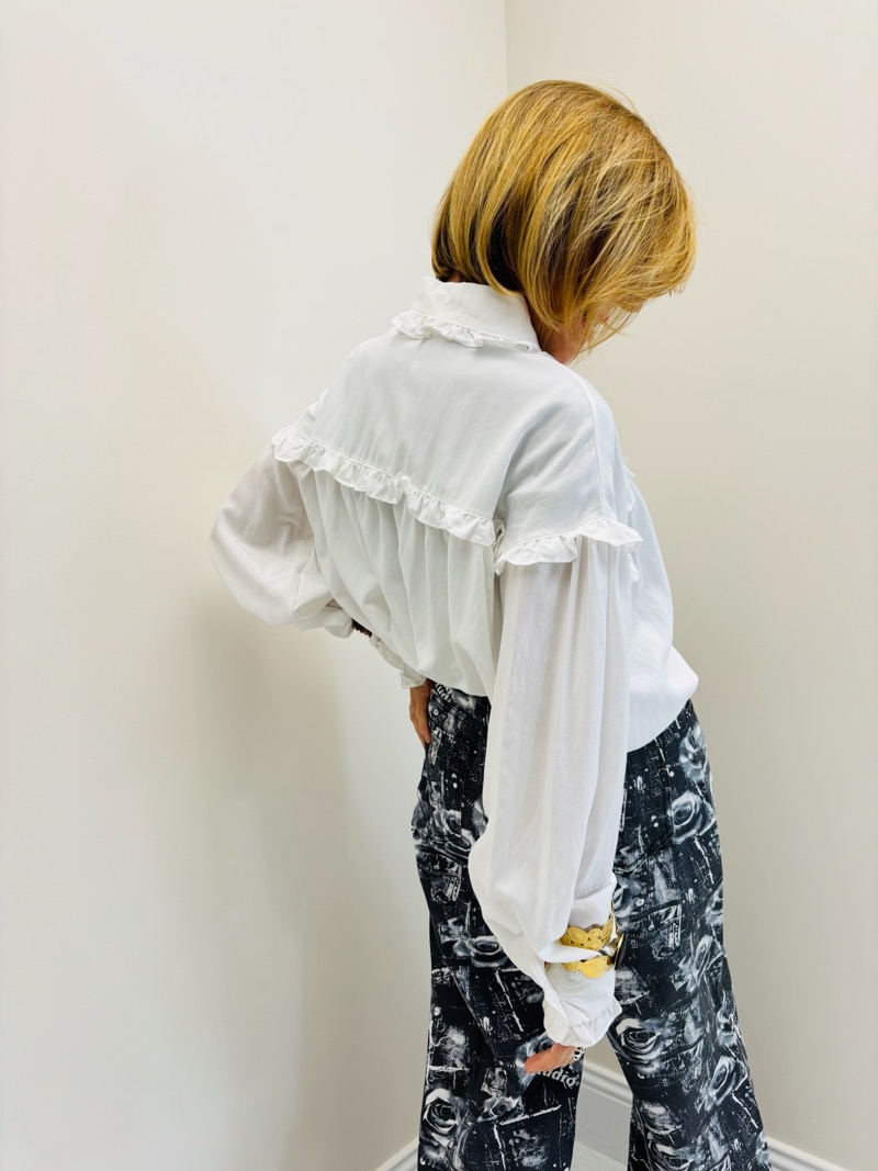 Cette chemise se porte idéalement avec un jean taille haute, un pantalon imprimé ou un pantalon tailleur pour créer un contraste moderne entre romantisme et caractère. Elle peut être portée rentrée pour structurer la silhouette ou légèrement blousée pour un effet plus décontracté. À associer avec des accessoires dorés ou minimalistes pour sublimer son esprit chic et féminin.