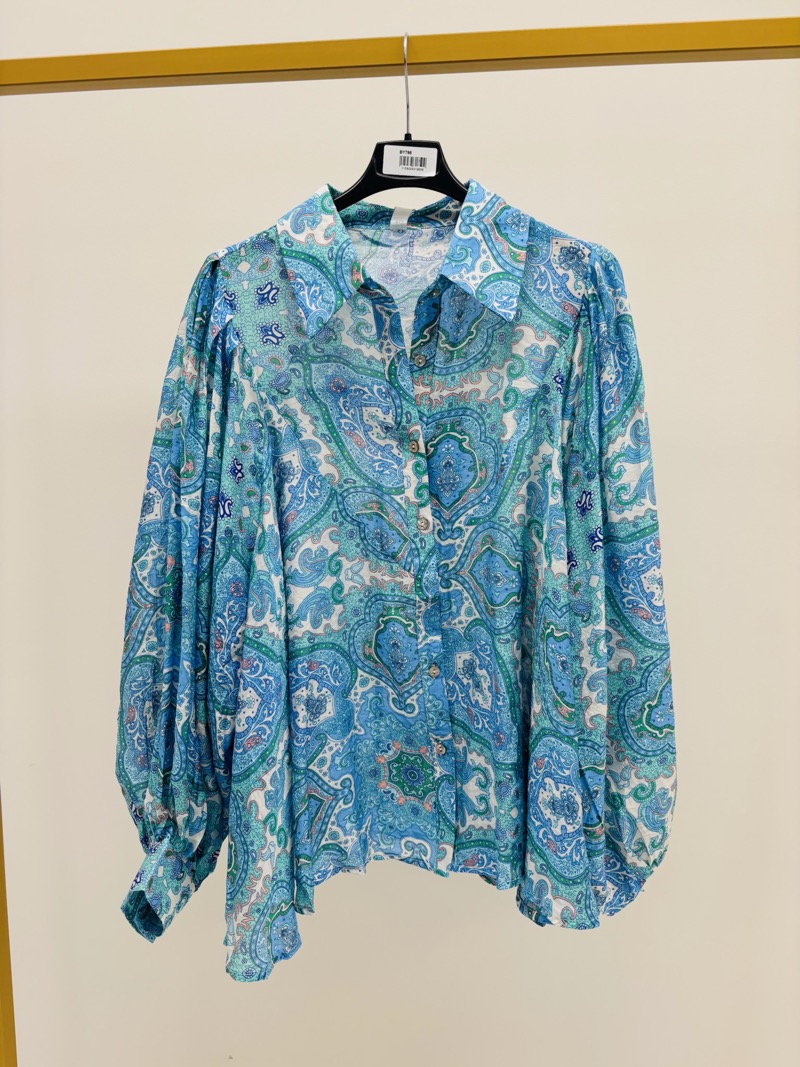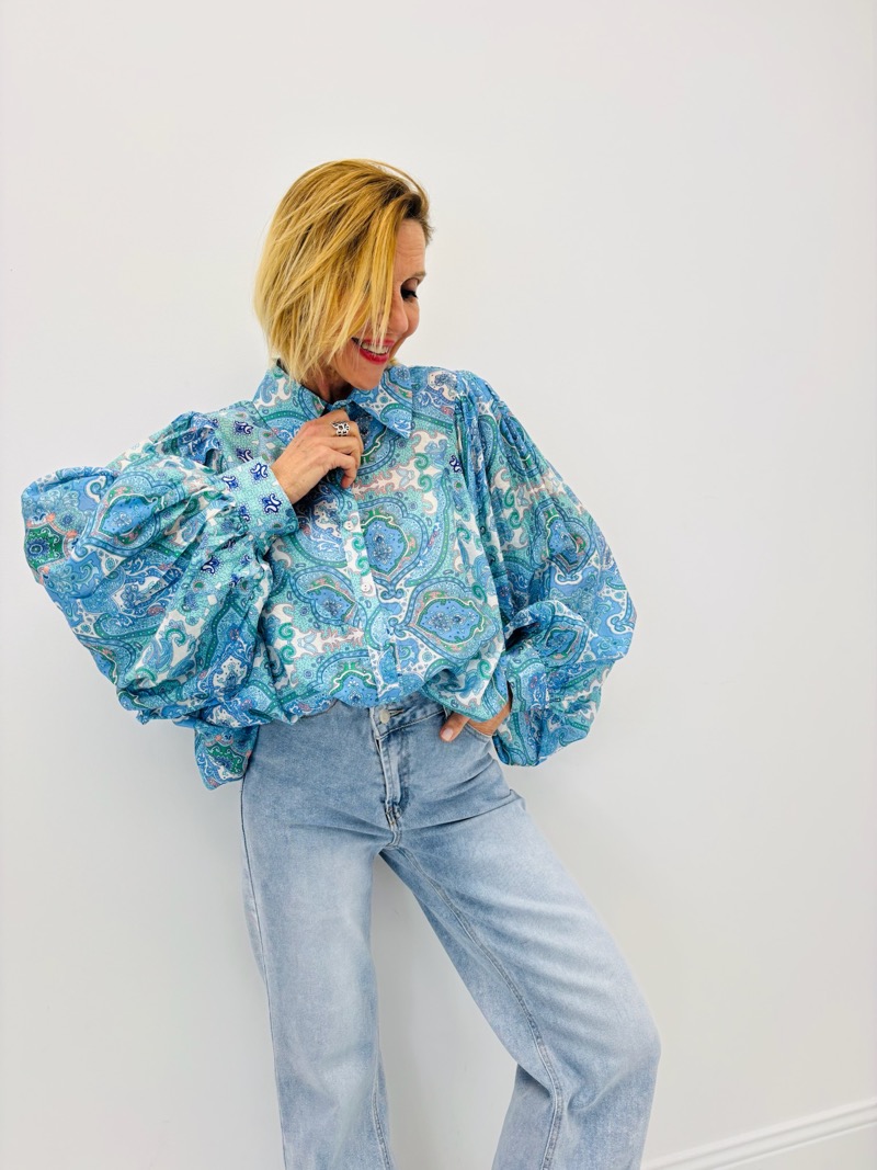 Cette chemise fluide au motif cachemire revisite l’esprit bohème avec une touche élégante et moderne. Son imprimé riche dans des nuances de bleu, turquoise et vert apporte immédiatement du caractère à la silhouette tout en restant facile à associer avec des pièces basiques du vestiaire.