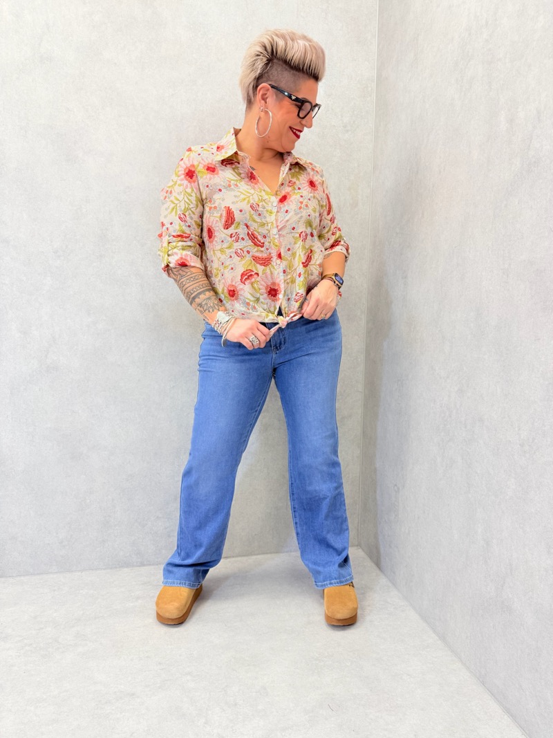 Cette chemise se porte parfaitement avec un jean clair ou un pantalon beige pour mettre en valeur l’imprimé lumineux. Portée nouée à la taille, elle apporte une touche moderne et féminine à la silhouette.