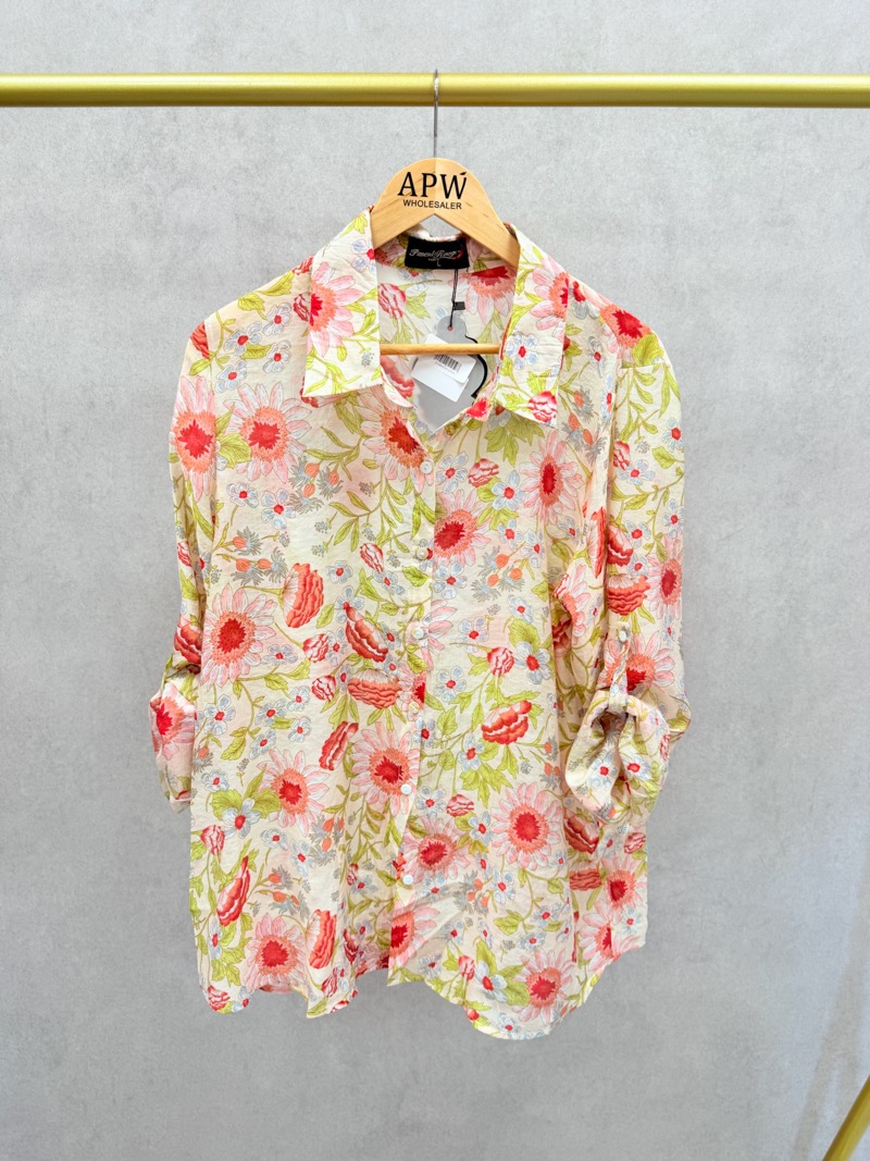 Douce et éclatante, cette chemise fluide séduit par son imprimé floral lumineux aux nuances corail, rose et vert tendre sur fond clair. Son motif délicat apporte fraîcheur et féminité tout en conservant une élégance naturelle.