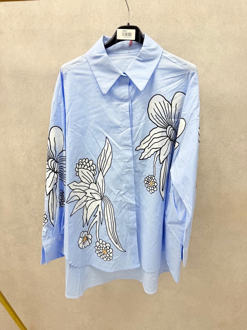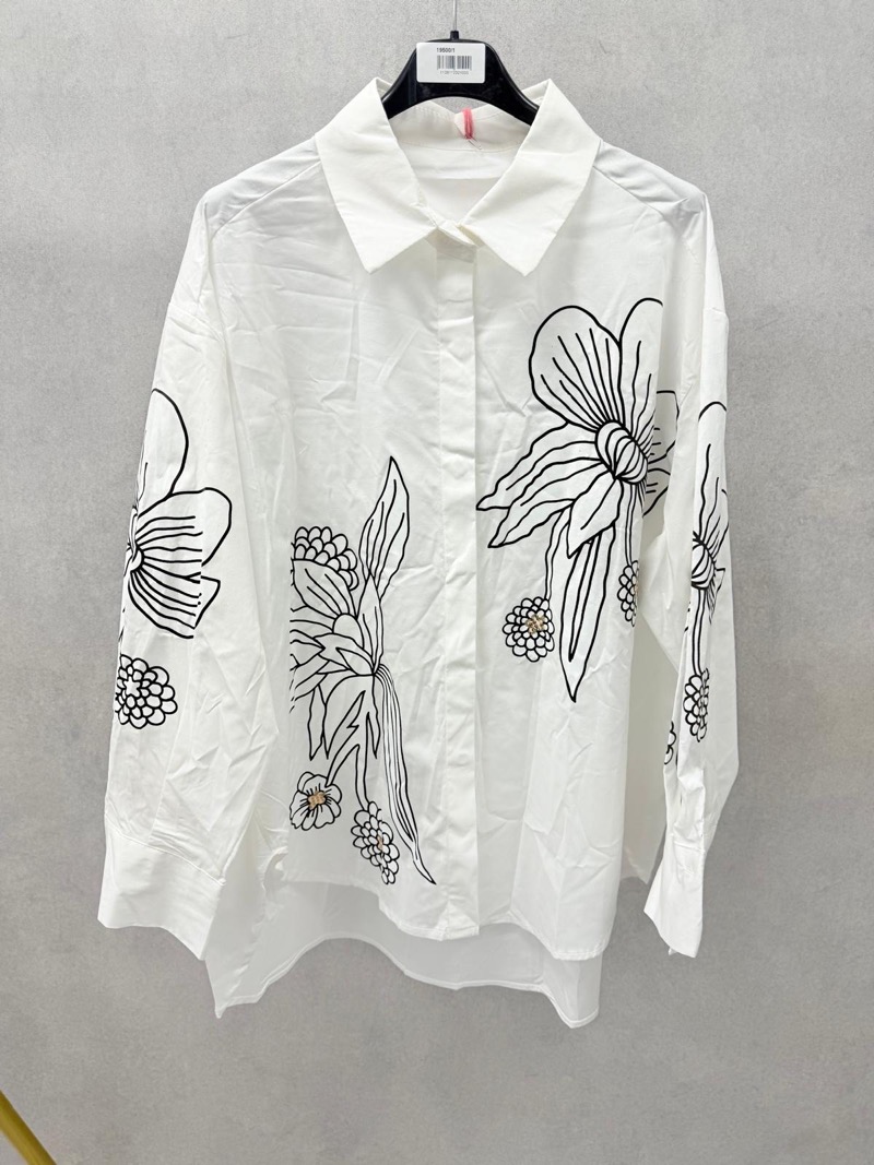 Le design se distingue par de grands motifs floraux noirs, effet esquisse, qui apportent une touche artistique et contemporaine à la chemise. Ces fleurs stylisées donnent un caractère unique à la pièce sans la surcharger, offrant un look chic et sophistiqué facile à porter au quotidien. L’imprimé est placé de manière harmonieuse sur l’avant, les manches et légèrement sur les côtés, créant une silhouette équilibrée et esthétique.