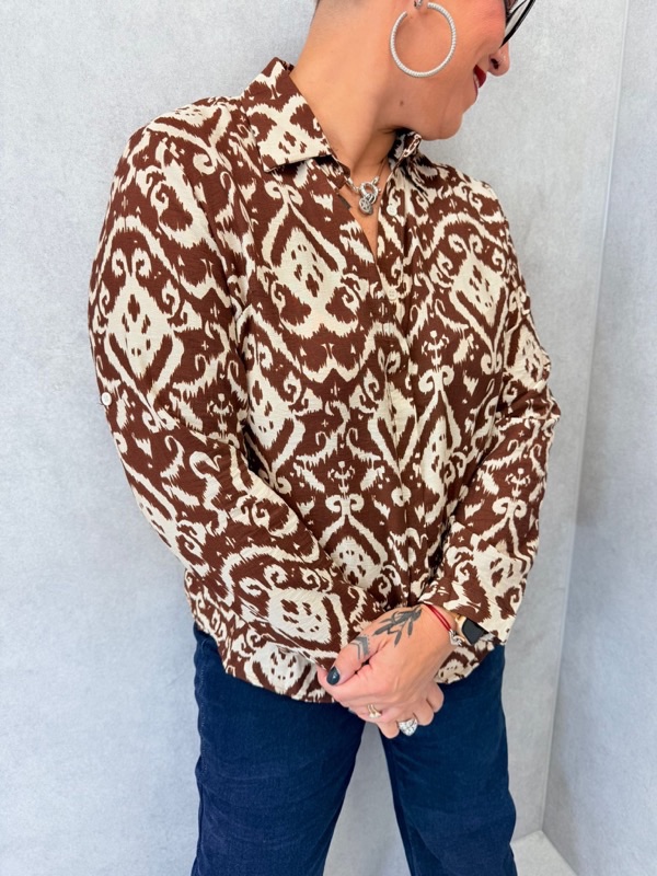 Craquez pour cette chemise fluide au style ethnique qui apportera une touche chic et tendance à vos looks du quotidien. Son imprimé contrasté marron et beige met en valeur la silhouette tout en restant facile à associer.