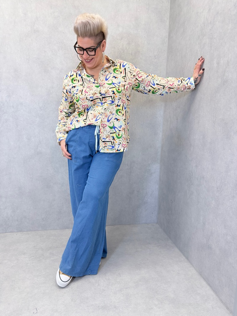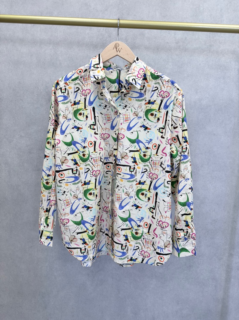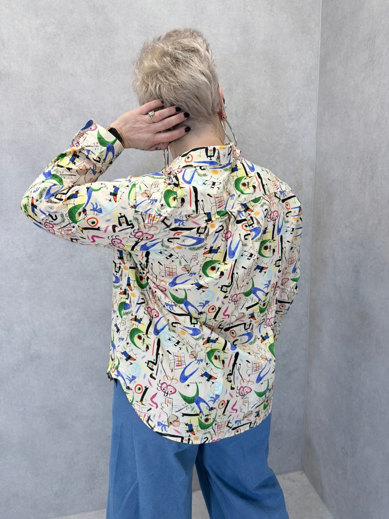 Audacieuse et créative, cette chemise imprimée séduit par son motif graphique inspiré de l’art moderne. Son jeu de formes abstraites et de couleurs vives sur fond clair apporte une touche dynamique et originale à la silhouette.