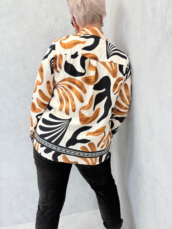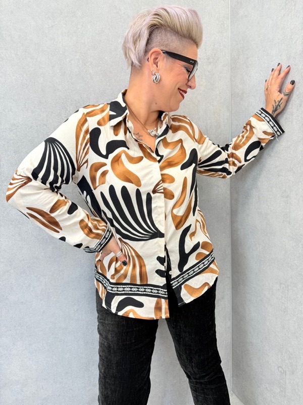 Imprimé original mélangeant motifs abstraits et graphiques dans des tons chauds (noir, camel, écru)
