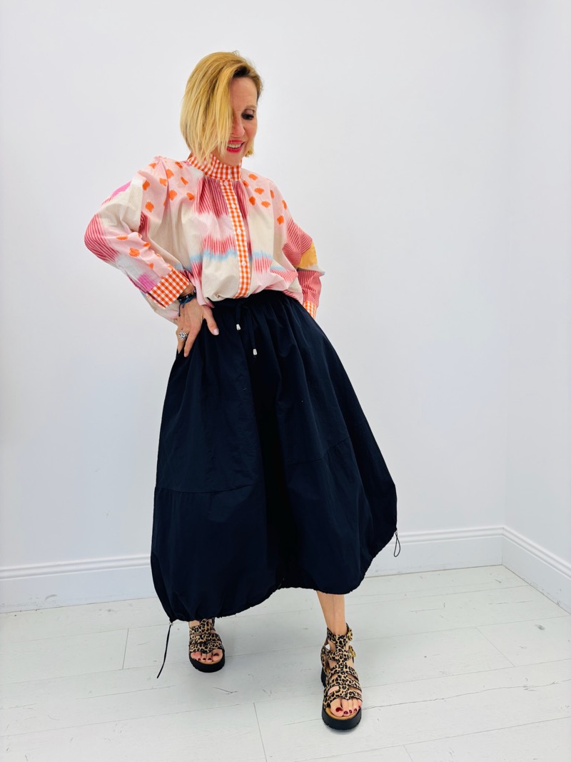 Cette chemise imprimée se porte parfaitement avec une jupe volumineuse ou un pantalon fluide pour créer une silhouette bohème chic moderne.