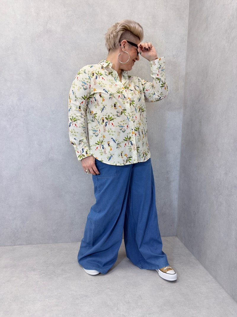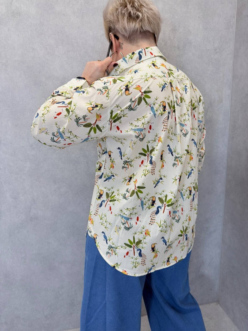 Fraîche et lumineuse, cette chemise imprimée s’inspire d’un univers tropical délicat mêlant feuillages, oiseaux colorés et détails végétaux. Son motif all-over apporte une touche d’évasion et de modernité tout en restant élégant et facile à porter au quotidien.