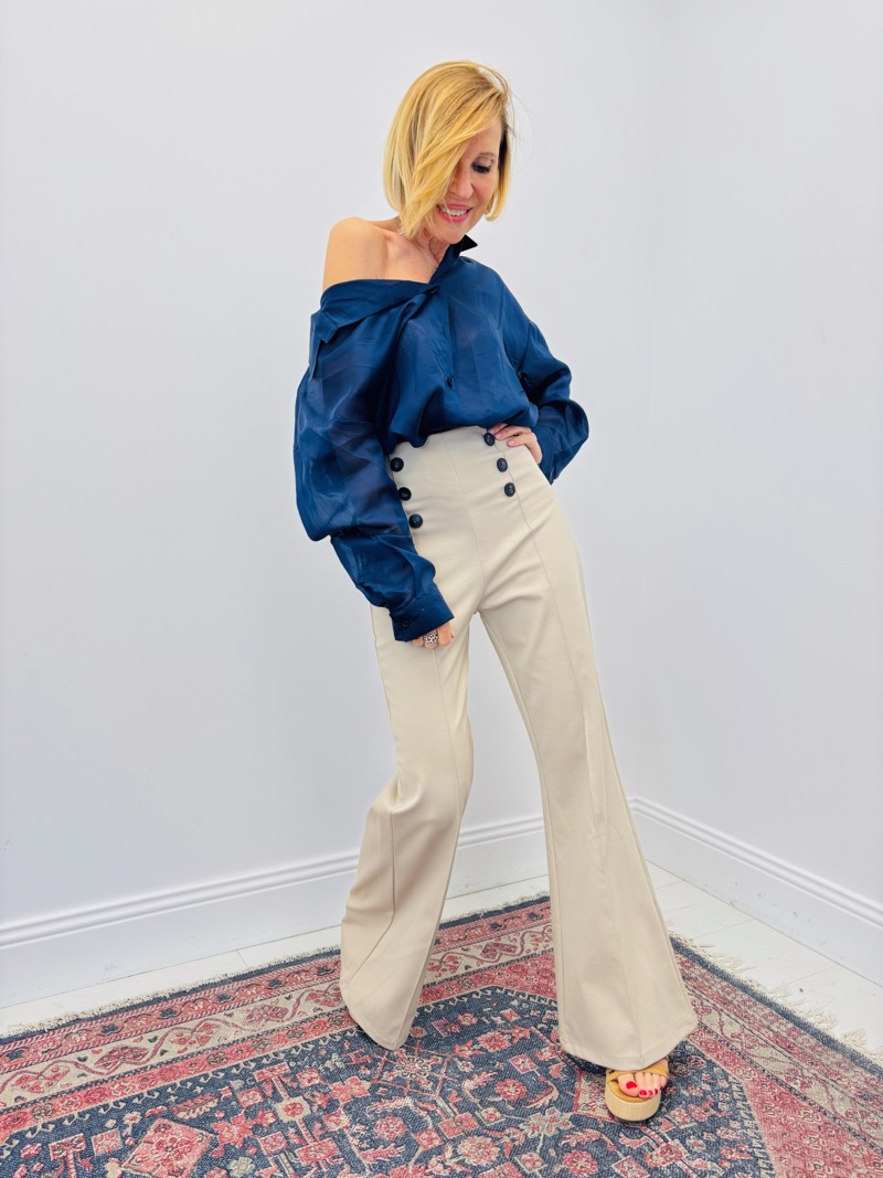 Portée rentrée dans un pantalon taille haute à pont, elle crée un contraste élégant entre fluidité et structure. En version blanche ou beige, elle apporte luminosité et raffinement à une silhouette chic.
