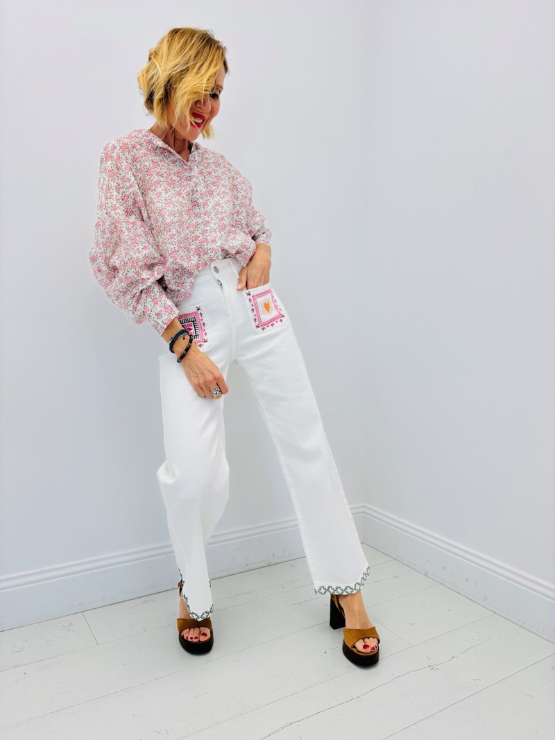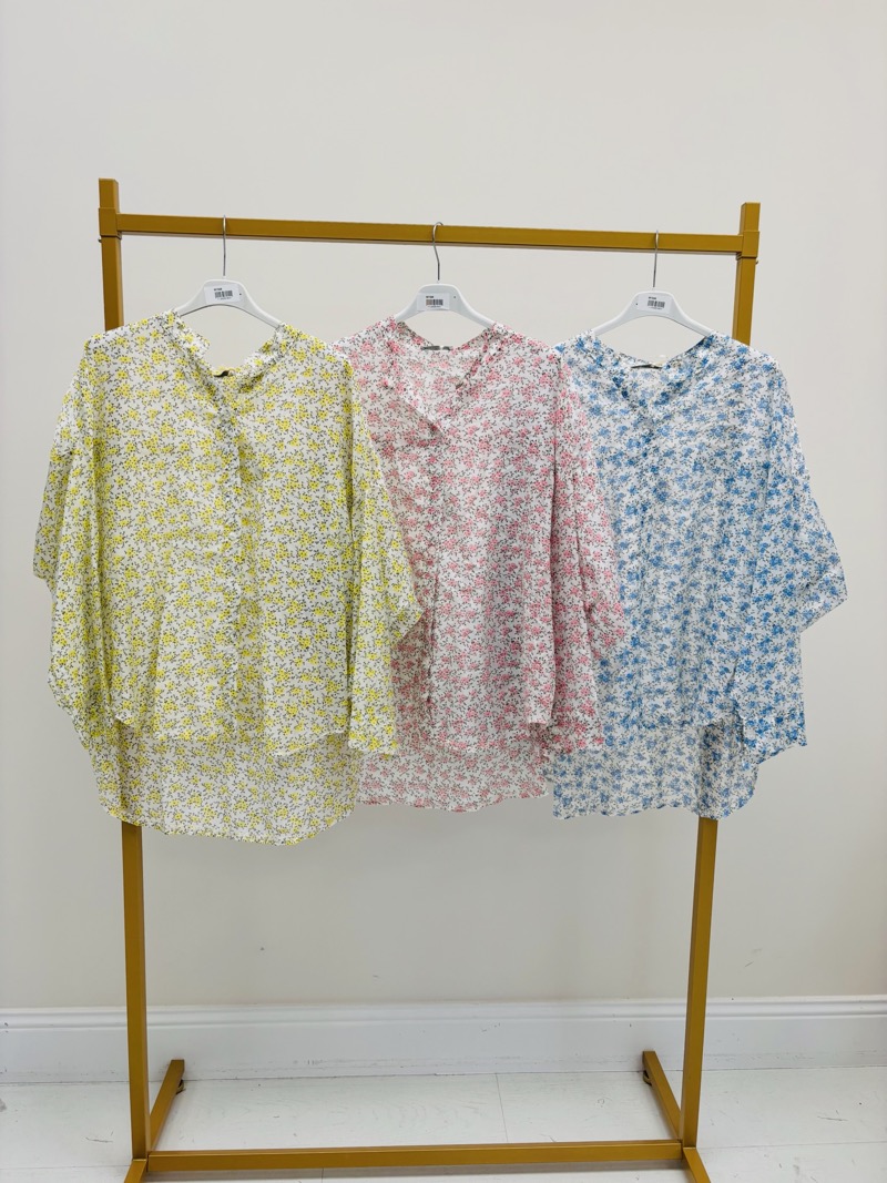 Son imprimé fleuri type liberty, fin et raffiné, habille la pièce avec élégance tout en restant facile à associer. Sa coupe oversize apporte un tombé fluide et aérien, offrant confort et modernité. Le col tunisien légèrement ouvert ajoute une touche casual chic, tandis que les manches amples renforcent son allure décontractée.