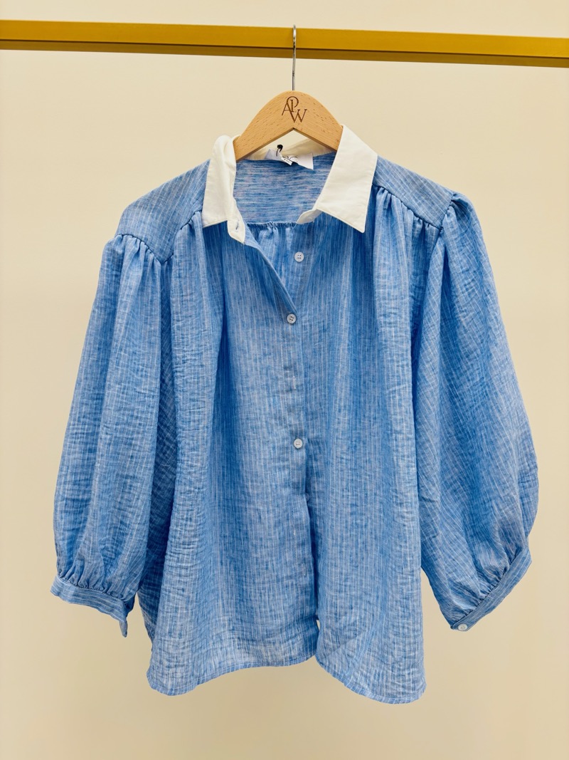 Le contraste entre le bleu doux de la chemise et le col blanc apporte une touche sophistiquée et moderne, idéale pour dynamiser une vitrine. Portée rentrée dans un pantalon taille haute ou ceinturée, elle met naturellement la silhouette en valeur.