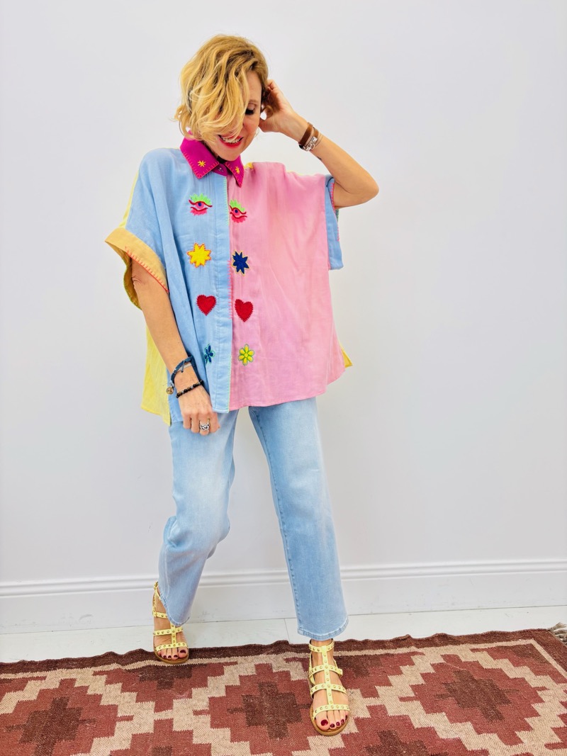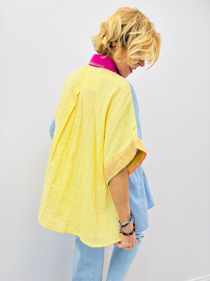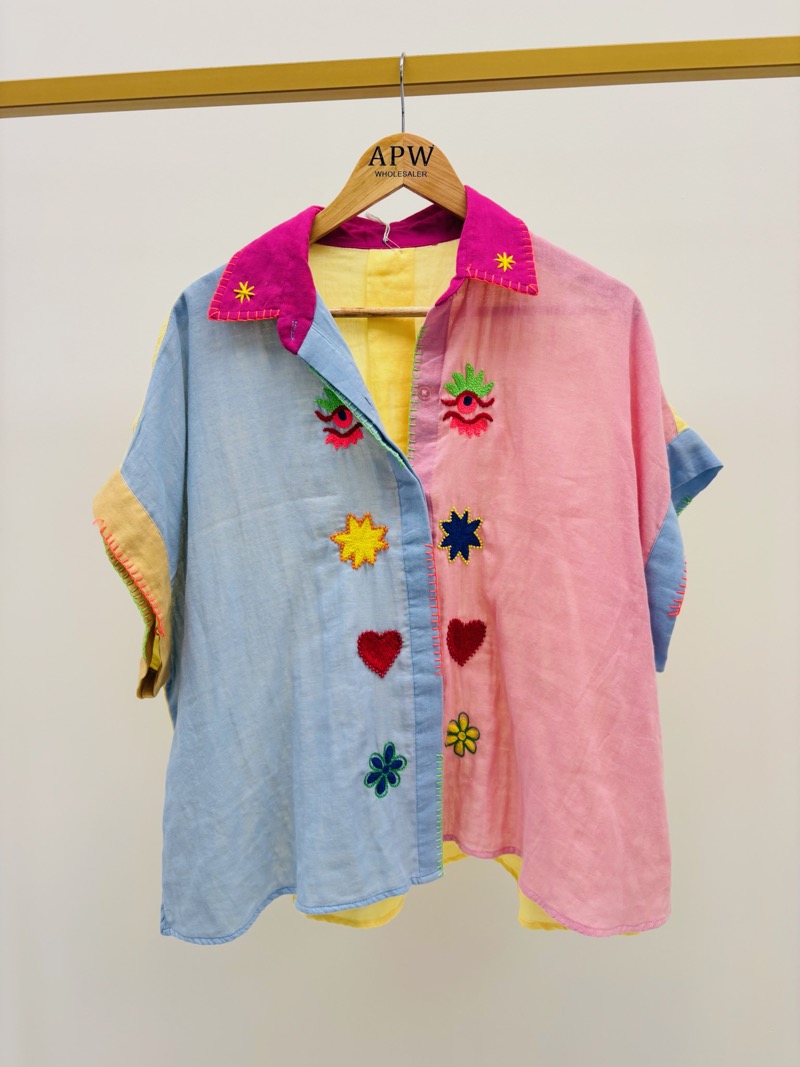 En boutique, cette chemise capte immédiatement l’attention grâce à ses couleurs vibrantes et ses broderies expressives. Une pièce idéale pour dynamiser la vitrine et stimuler les ventes complémentaires avec denim, accessoires colorés ou sandales estivales.