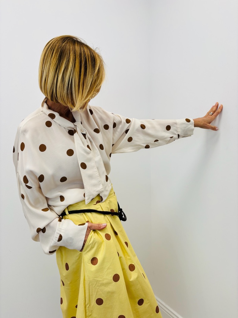 Portée rentrée dans une jupe midi taille haute ou un pantalon fluide, elle crée une silhouette féminine et élégante. La version écru à pois camel s’associe parfaitement à des tons chauds comme le jaune, le camel ou le chocolat pour un look lumineux et affirmé.