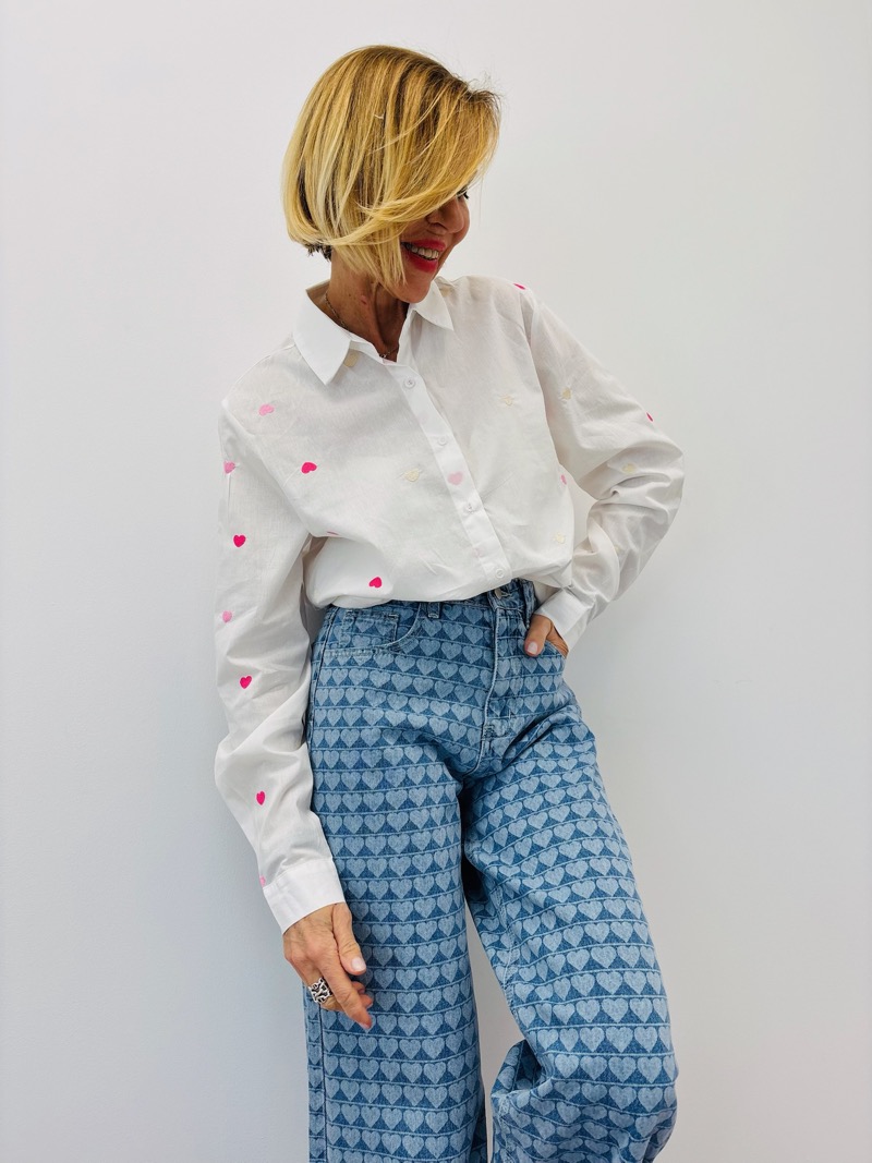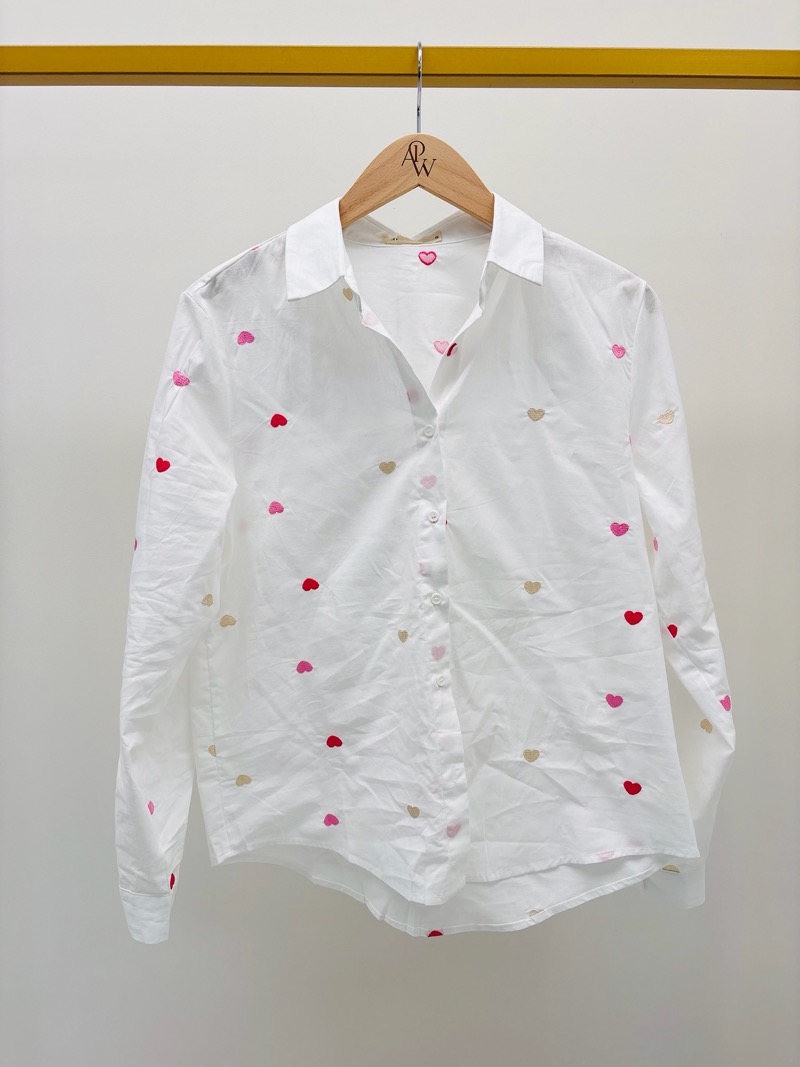 Fraîche, féminine et facile à porter, cette chemise en 100% coton à motifs cœurs est la pièce idéale pour dynamiser une collection avec une touche romantique subtile. Son fond blanc lumineux met en valeur les petits cœurs brodés ou imprimés aux nuances de rose, rouge et beige, apportant douceur et modernité.
