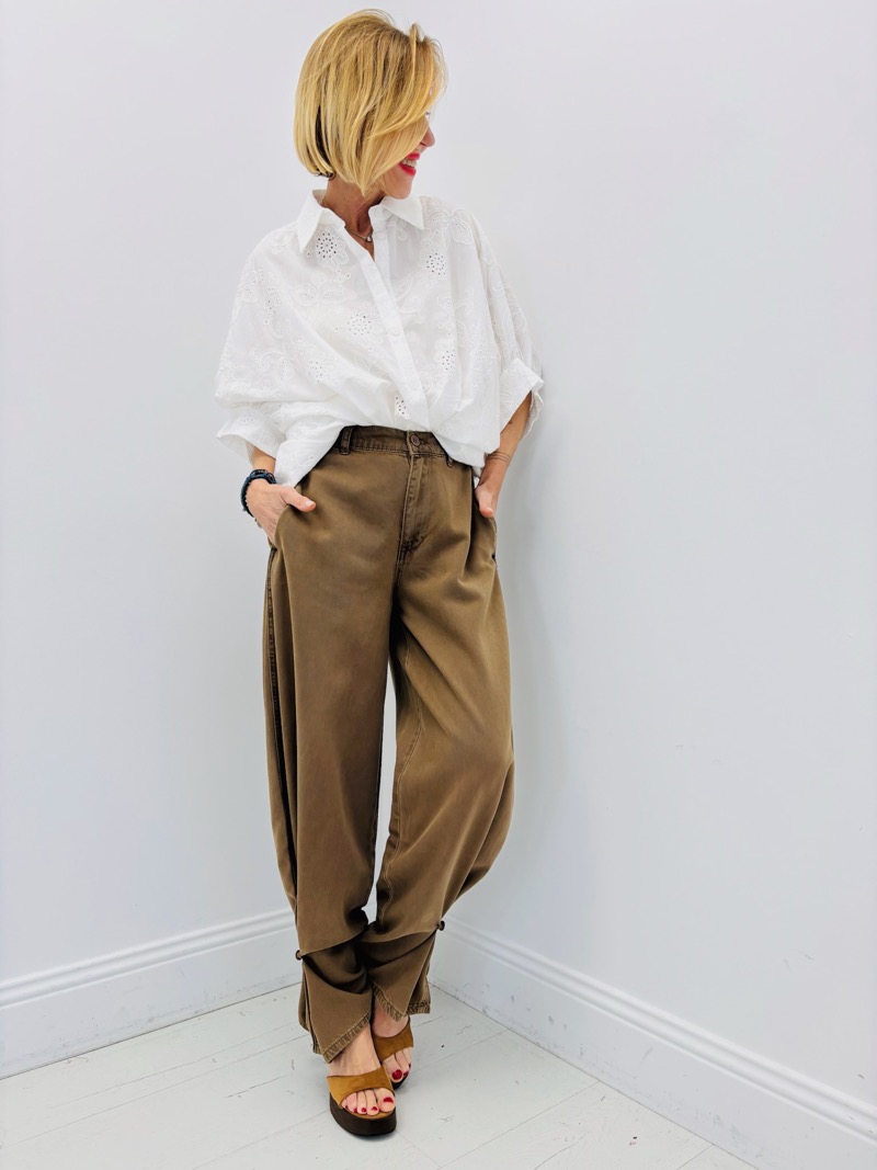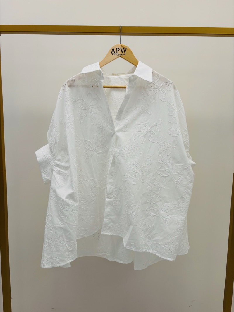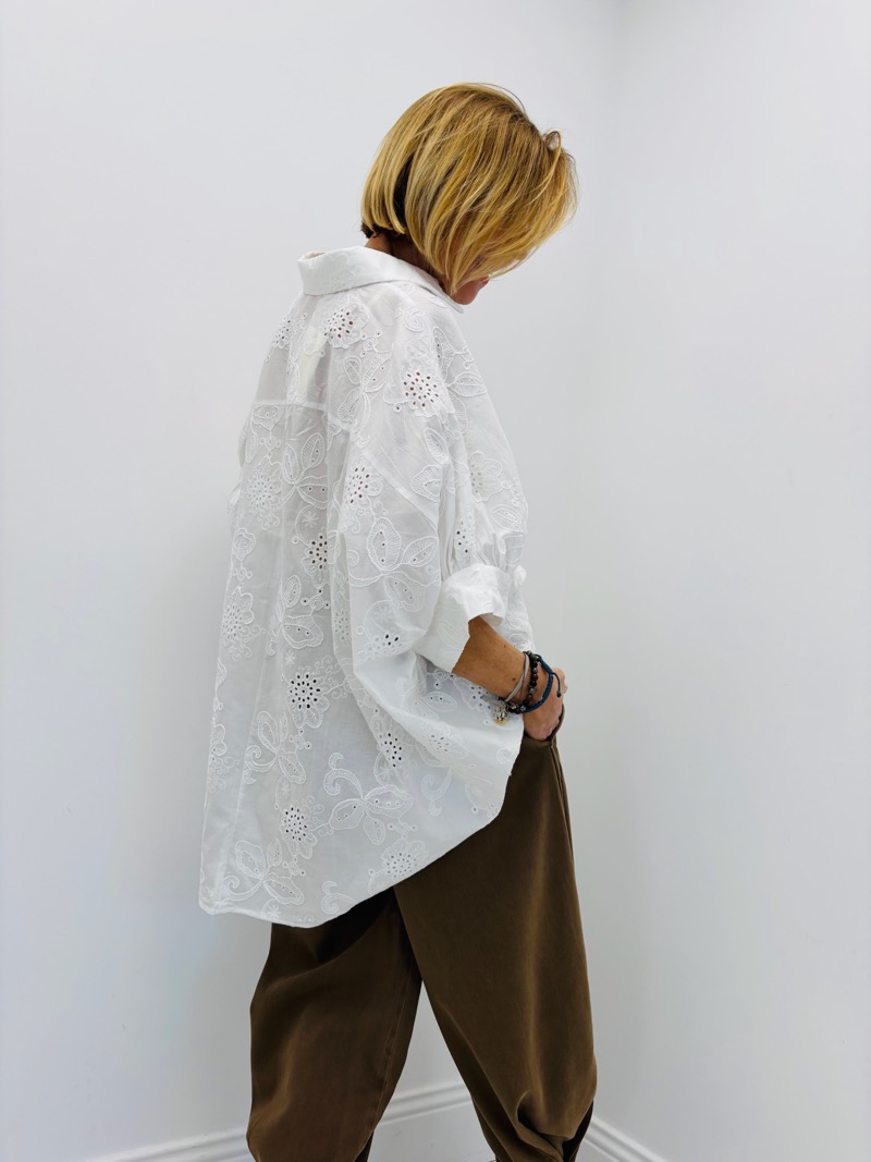 Adoptez un style élégant et intemporel avec notre chemise oversize ornée de broderie anglaise. Confectionnée en pur coton, elle allie confort et raffinement pour accompagner vos journées avec grâce.