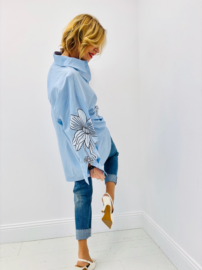 Le modèle se distingue par son imprimé floral graphique, dessiné en contraste, qui apporte du caractère tout en restant élégant. Les fleurs oversize, placées avec équilibre sur le devant et les manches, créent un visuel fort et tendance, sans surcharger la silhouette. Le col chemise classique structure l’ensemble et souligne l’allure chic de la pièce.