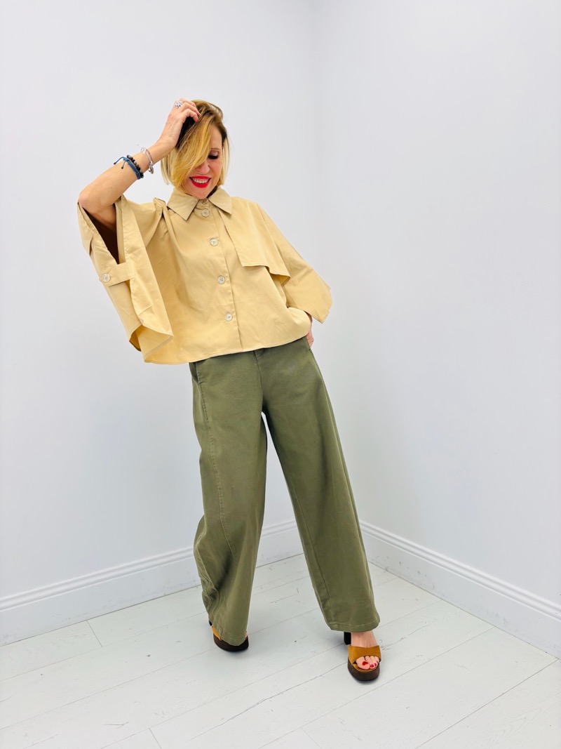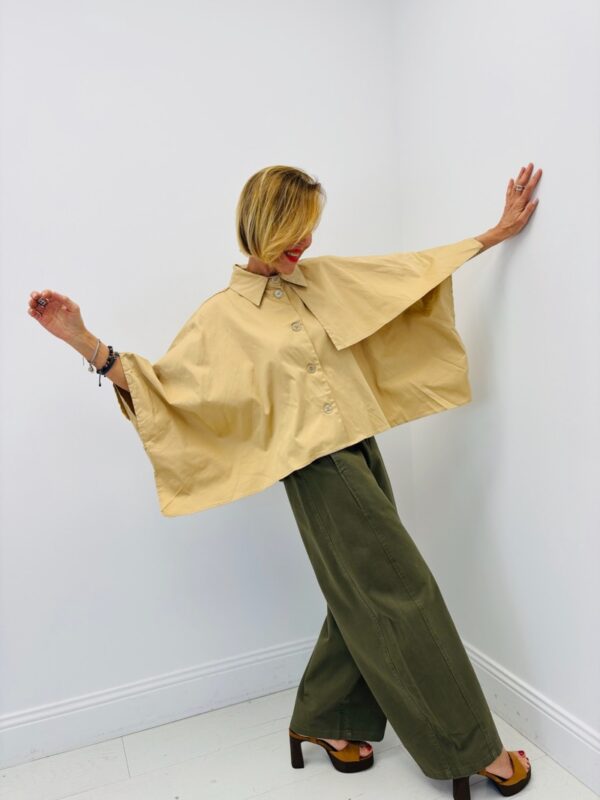 Le détail du pan asymétrique et la coupe large des manches créent une allure contemporaine, idéale pour un look mode affirmé. Sa teinte beige naturelle en fait une pièce facile à associer, parfaite pour la mi-saison ou les looks estivaux sophistiqués.