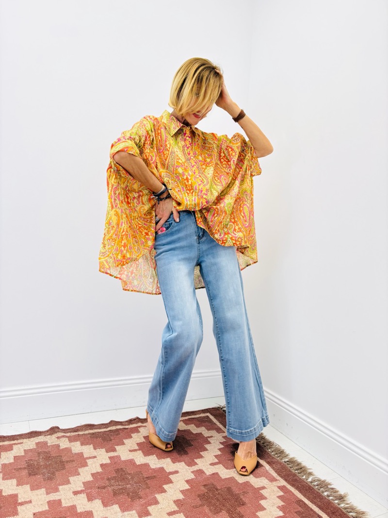 Cette chemise oversize à imprimé paisley revisite l’esprit bohème avec une palette vibrante mêlant orange, jaune soleil, rose fuchsia et touches de vert. Une vraie pièce “coup d’œil” parfaite pour dynamiser une vitrine ou un live.