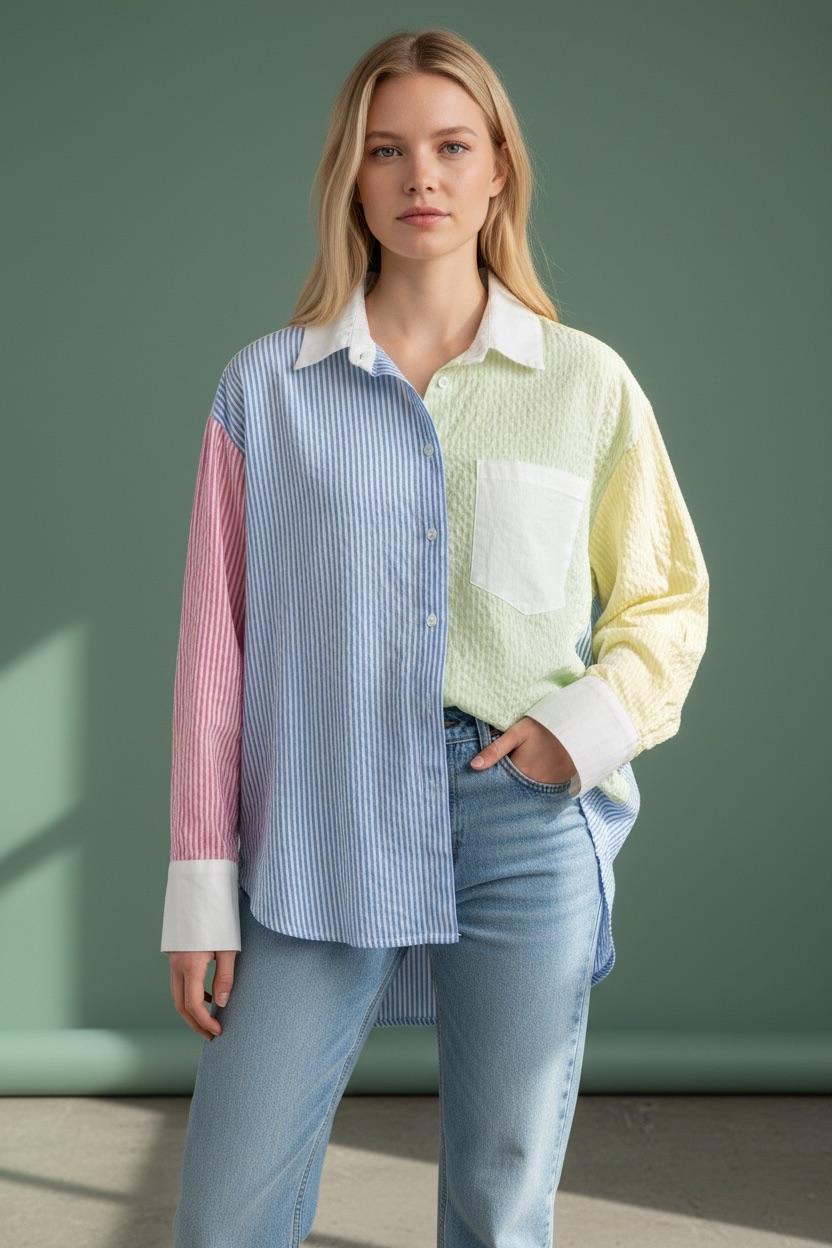 Le jeu de panneaux contrastés – rayures fines bleues, vert tendre texturé, touches de rose et de jaune – apporte du rythme et du caractère à la pièce. Le col blanc contrastant structure l’ensemble et équilibre parfaitement l’audace du patchwork, offrant un rendu chic et facile à porter. La poche poitrine ton sur ton ajoute une note casual et fonctionnelle.