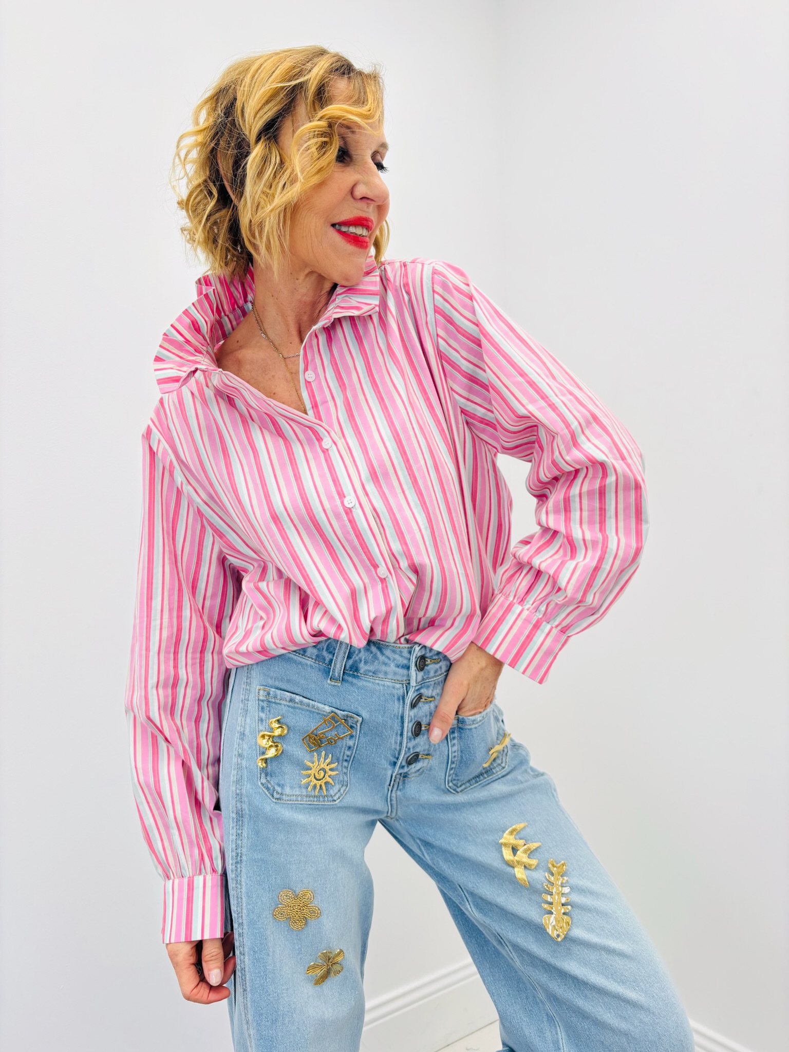 Les rayures verticales apportent de la structure à la silhouette et allongent visuellement la ligne. Le col victorien, subtilement montant et légèrement froncé, donne à la chemise une allure féminine et raffinée, tout en conservant un esprit moderne. La patte de boutonnage discrète sur le devant renforce son style épuré et élégant.