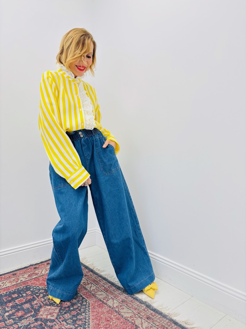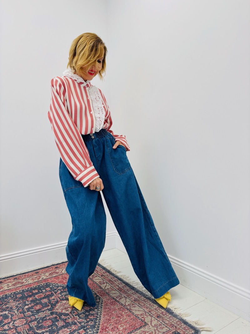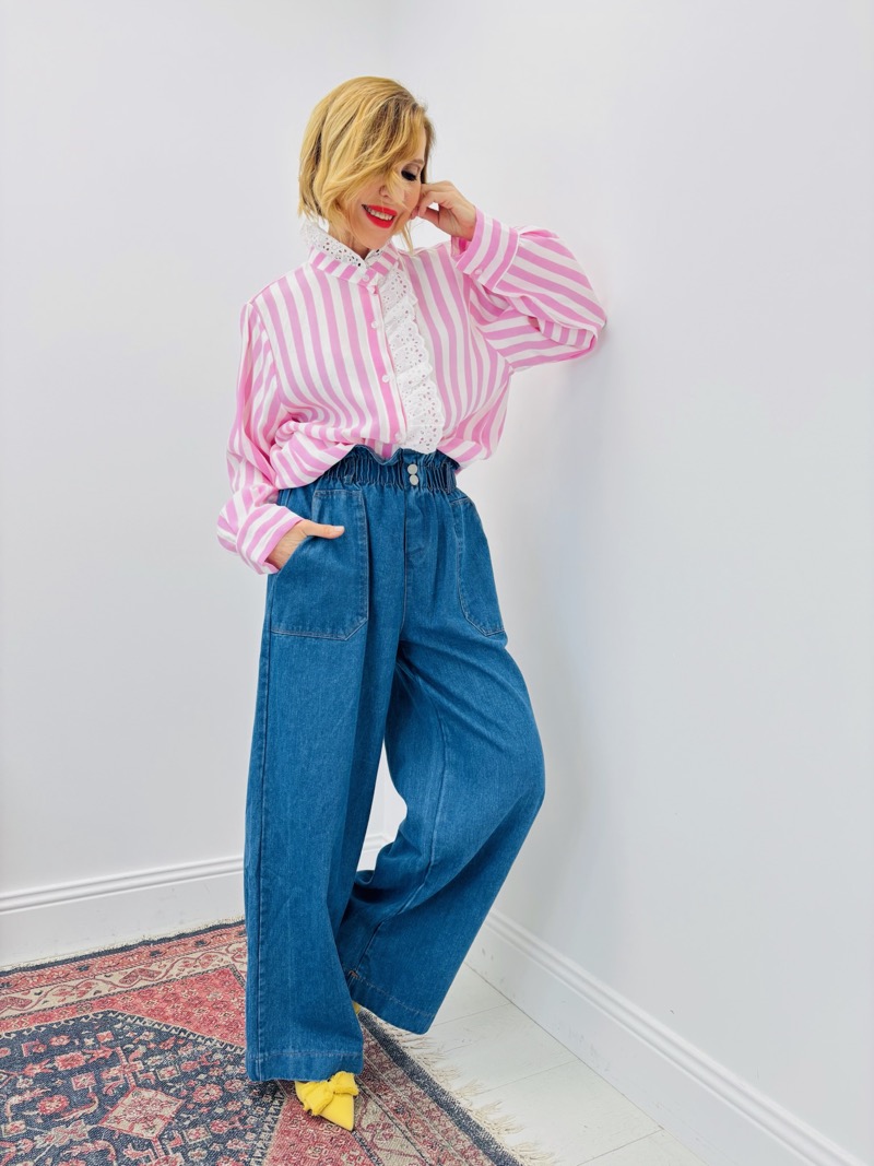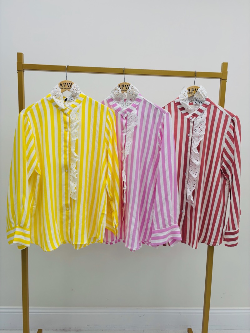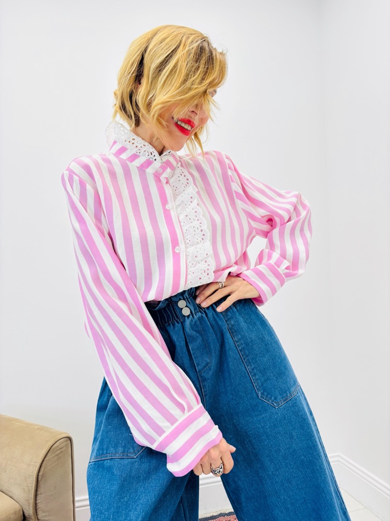 Cette chemise rayée au col victorien est une pièce au charme intemporel, qui mêle élégance rétro et modernité. Son design raffiné se distingue par un superbe détail de broderie anglaise placé le long de la patte de boutonnage et du col, apportant une touche romantique et délicate à la silhouette.