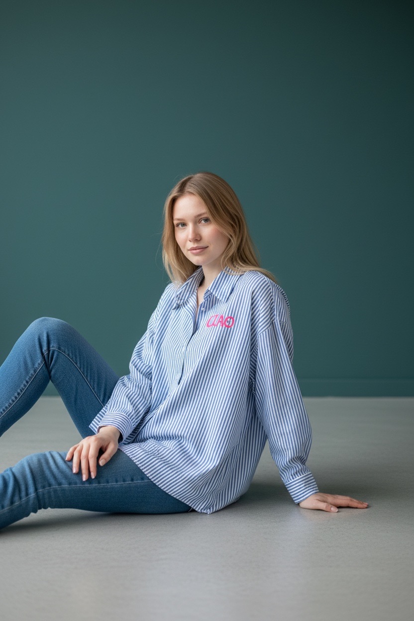 Le détail qui fait toute la différence réside dans son message “Ciao” imprimé : discret sur le devant et affirmé au dos, il apporte une note pop et décalée, parfaitement dans l’air du temps. Le jeu de couleurs du lettrage crée un contraste dynamique avec les rayures, donnant à la chemise une vraie identité mode sans en faire trop.
