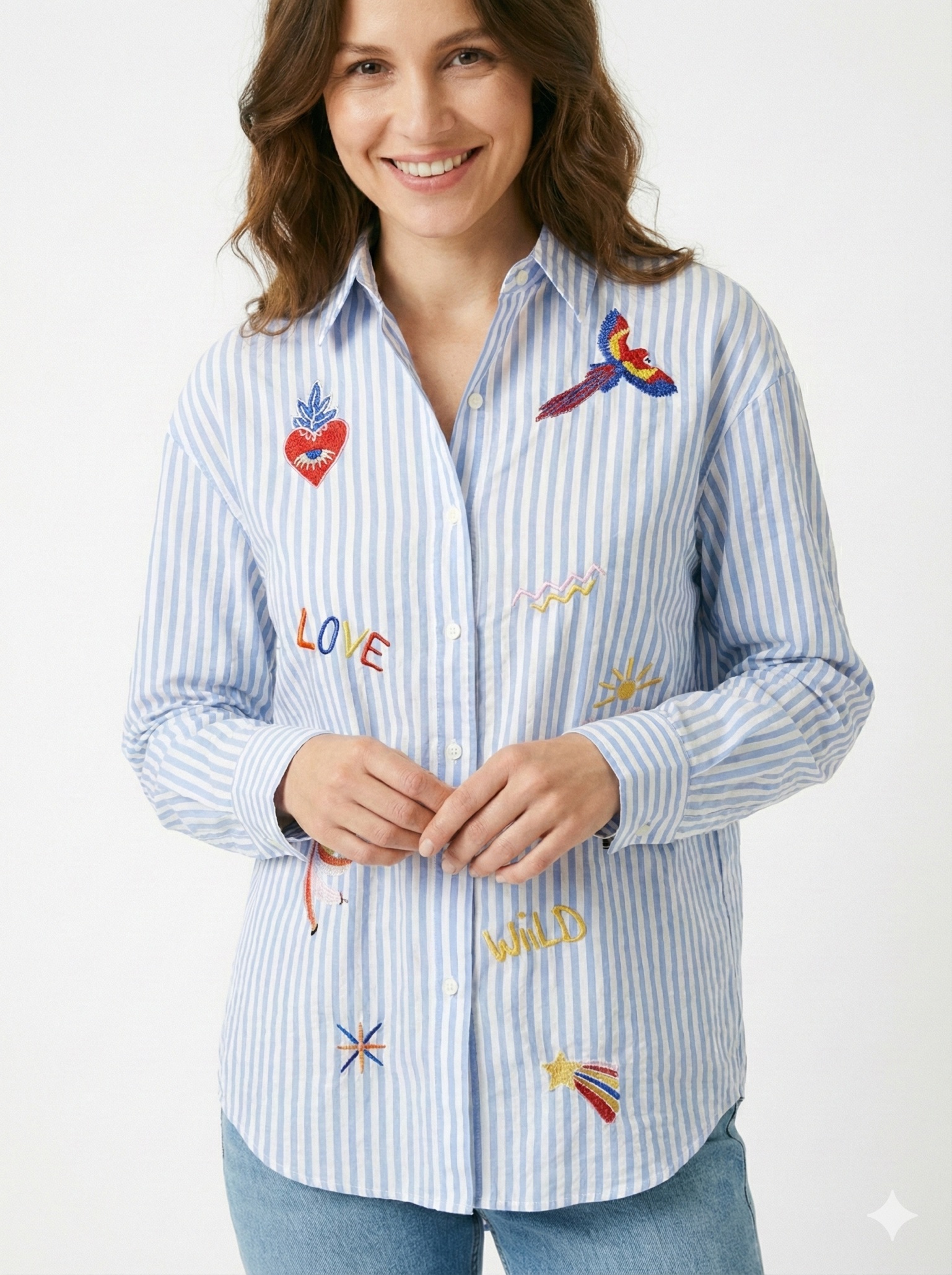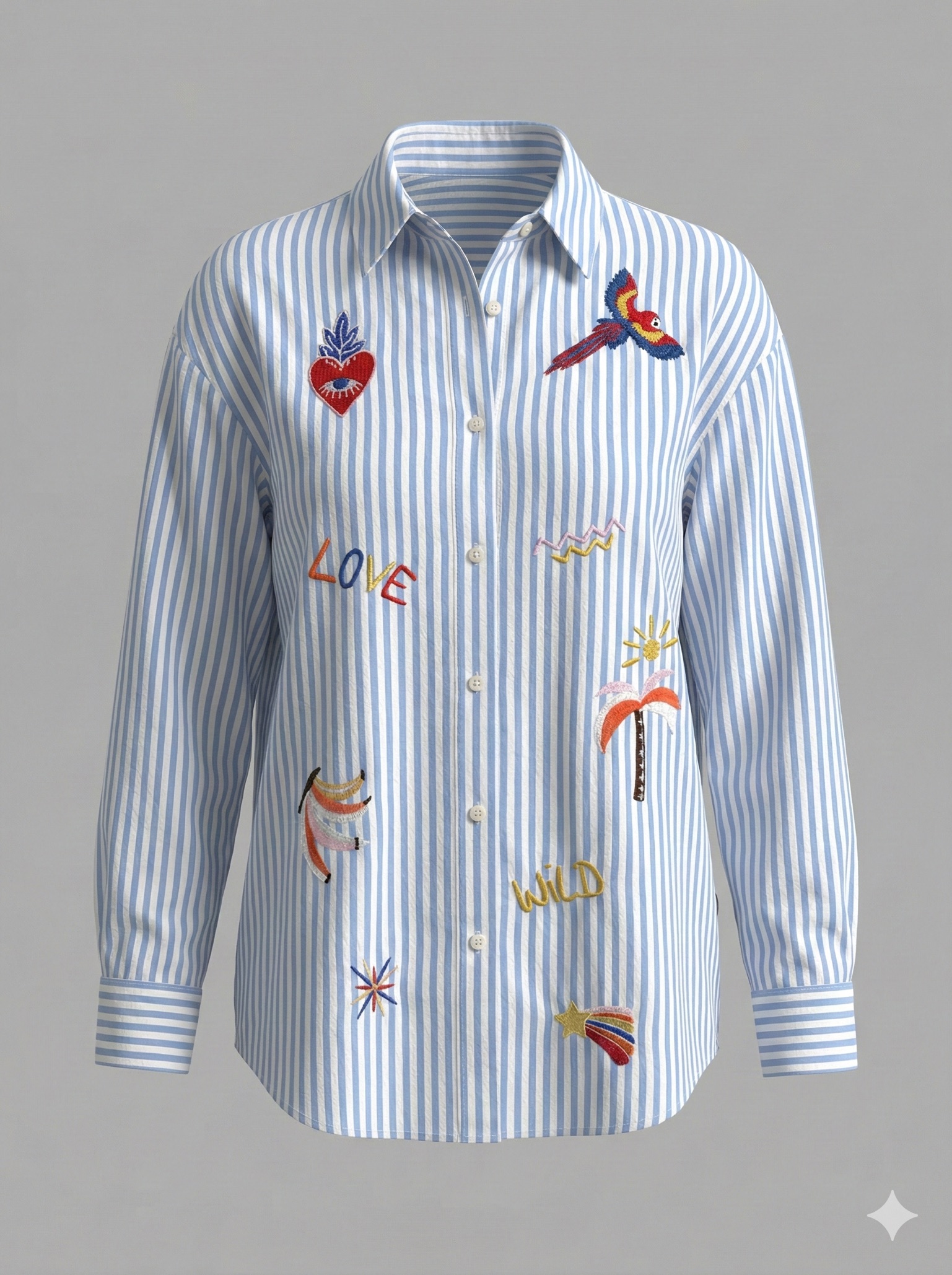 Pensée comme une pièce forte, cette chemise se distingue par ses patchs brodés esprit pop et solaire : cœur, oiseau, mots brodés et symboles graphiques qui insufflent une énergie positive et un style affirmé. Chaque détail est travaillé avec soin pour apporter du relief et une vraie valeur mode au produit.