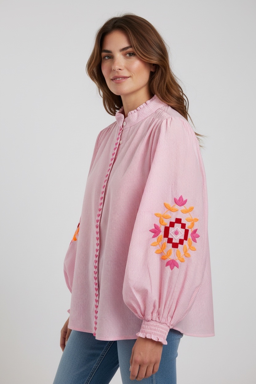 Le tissu à rayures fines structure visuellement la silhouette, tandis que les broderies contrastées apportent une vraie signature mode. Le travail de broderie sur le devant et sur les manches donne du relief et une identité unique à la pièce, tout en restant facile à intégrer dans un vestiaire quotidien. Le col montant délicatement froncé ajoute une touche féminine et sophistiquée.