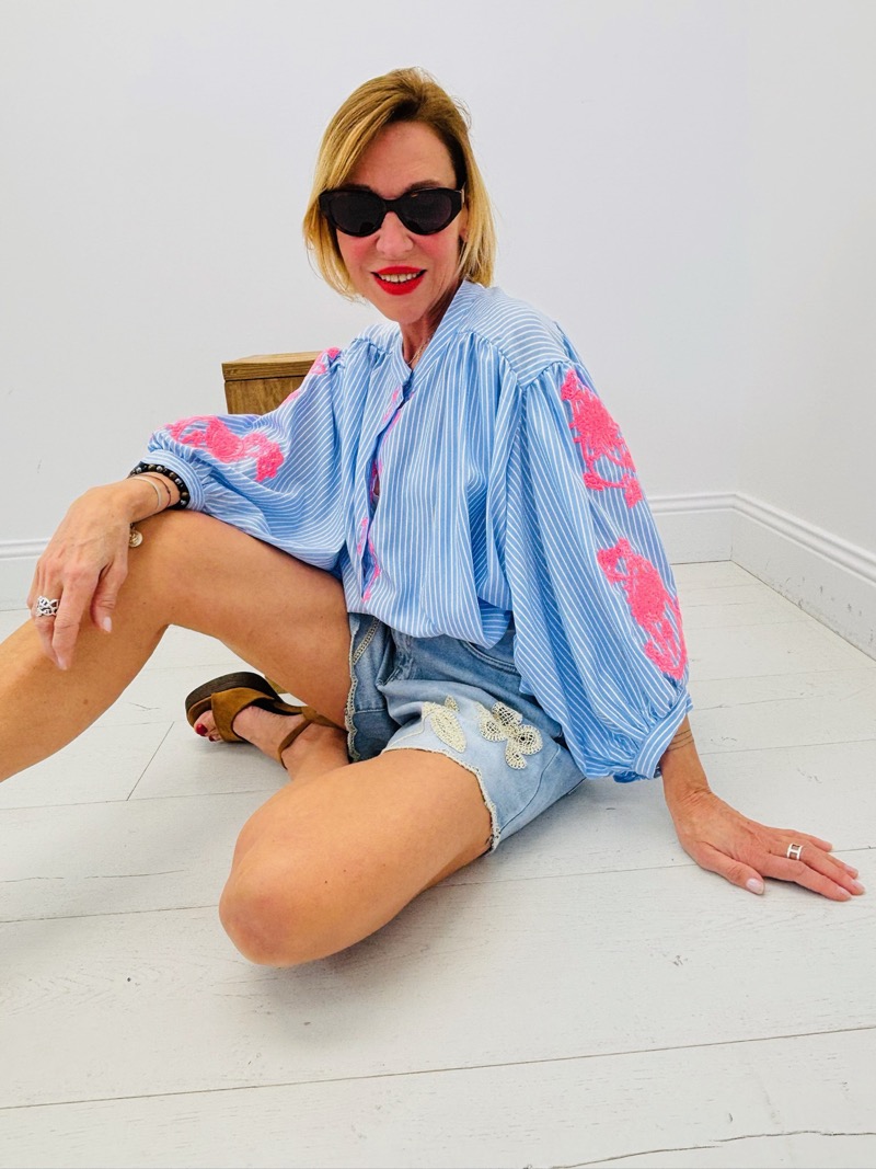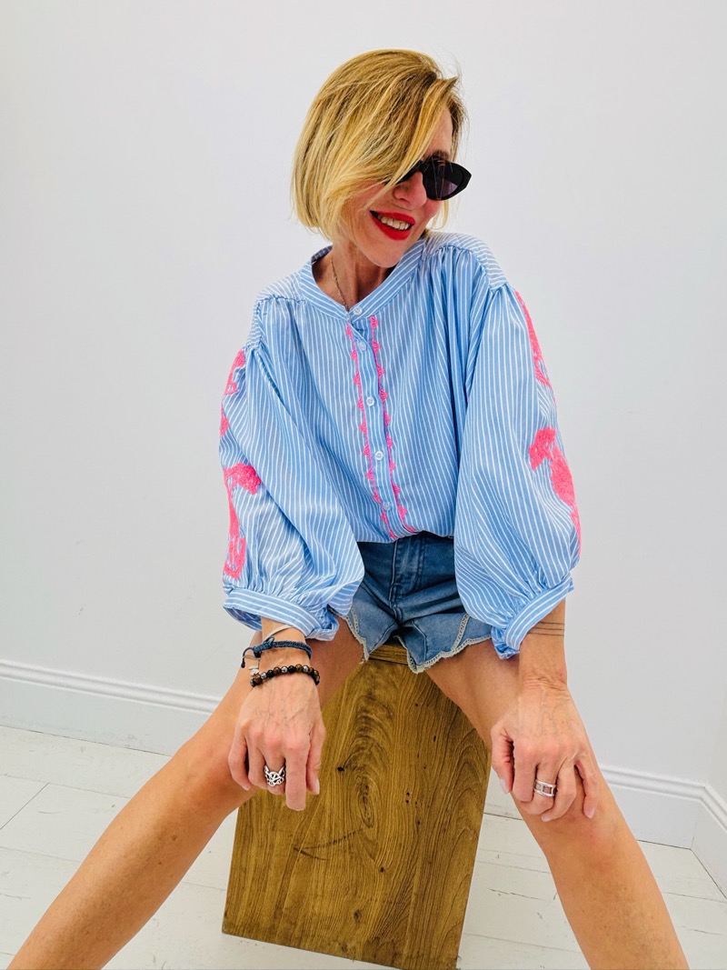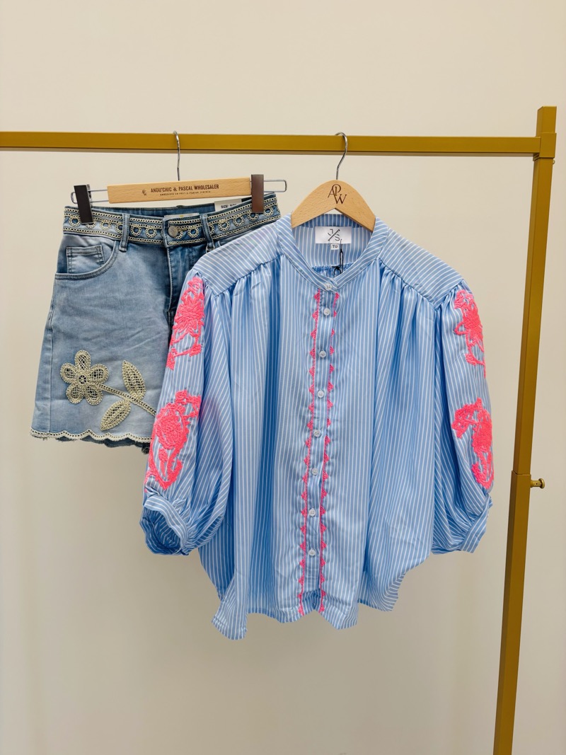 Les rayures verticales allongent la silhouette tandis que les broderies roses sur les manches et le long de la patte de boutonnage apportent une touche féminine et moderne. Le contraste entre le bleu et le rose crée un effet visuel très attractif en boutique.