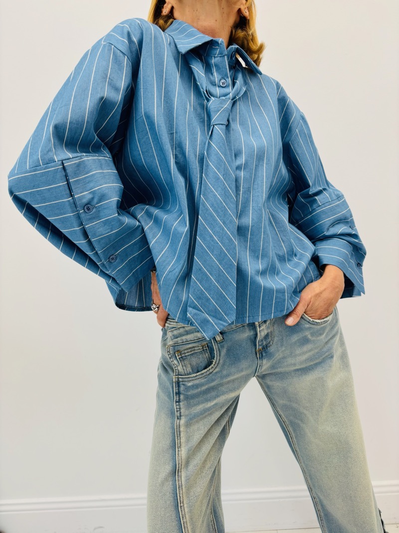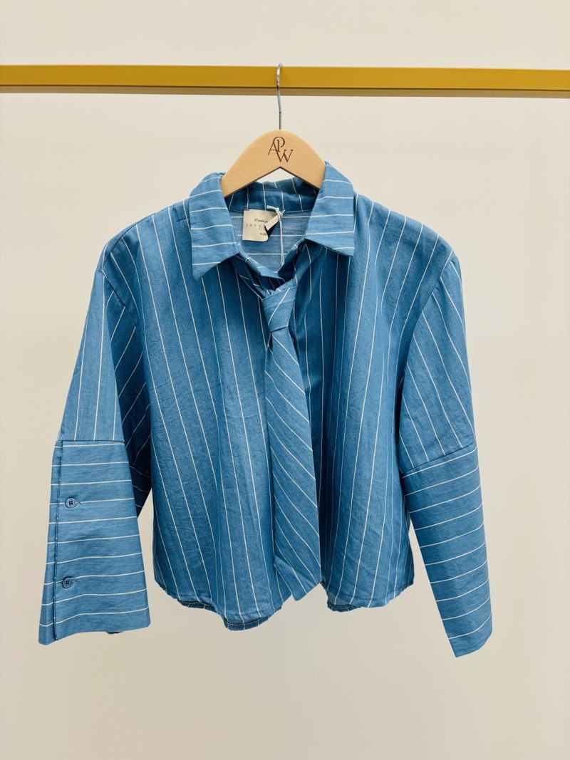Cette chemise rayée revisite l’esprit tailoring avec une coupe courte moderne et un détail cravate intégré qui apporte immédiatement une touche mode à la silhouette. Son design structuré inspiré du vestiaire masculin est réinterprété de façon féminine pour créer une pièce originale et tendance.