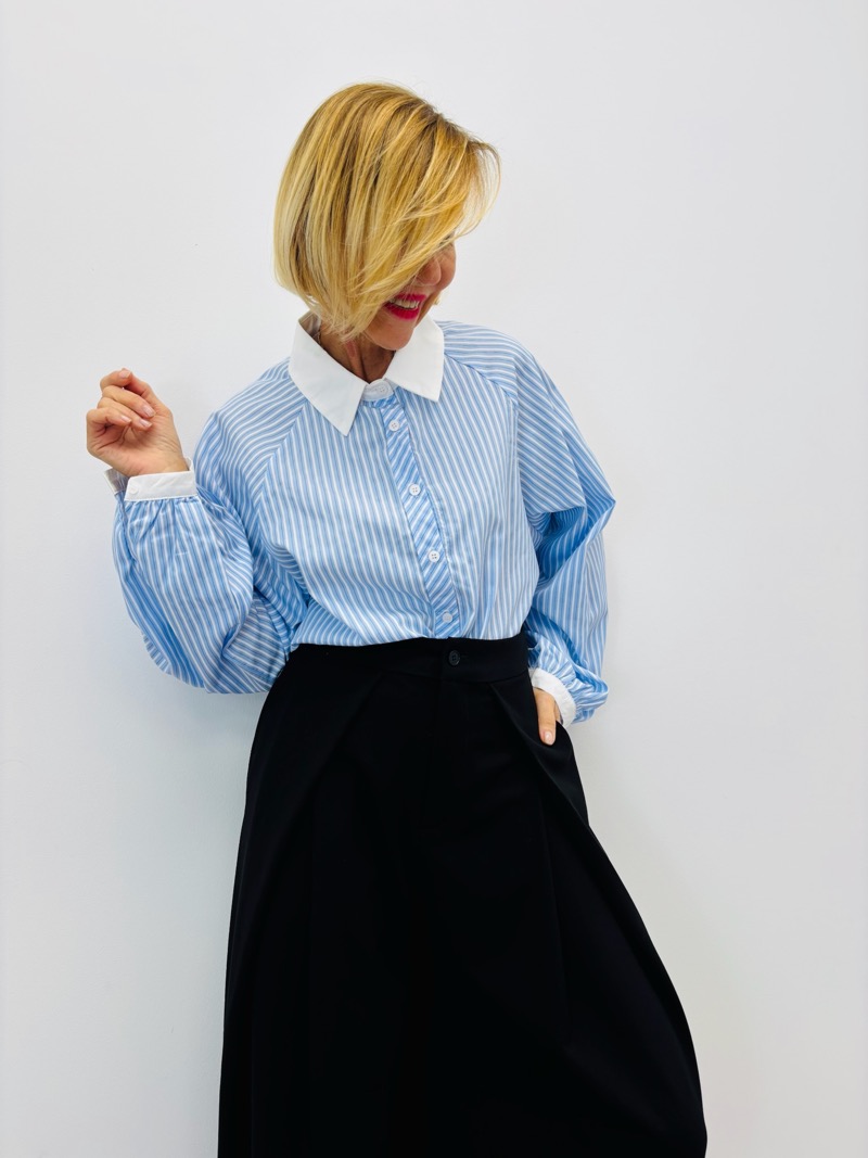 Sa coupe courte légèrement boxy structure la silhouette et permet de la porter aussi bien rentrée que laissée libre sur un pantalon taille haute. Les manches longues avec poignets blancs contrastés renforcent son esprit chemise élégante, tandis que les rayures verticales allongent visuellement la ligne.