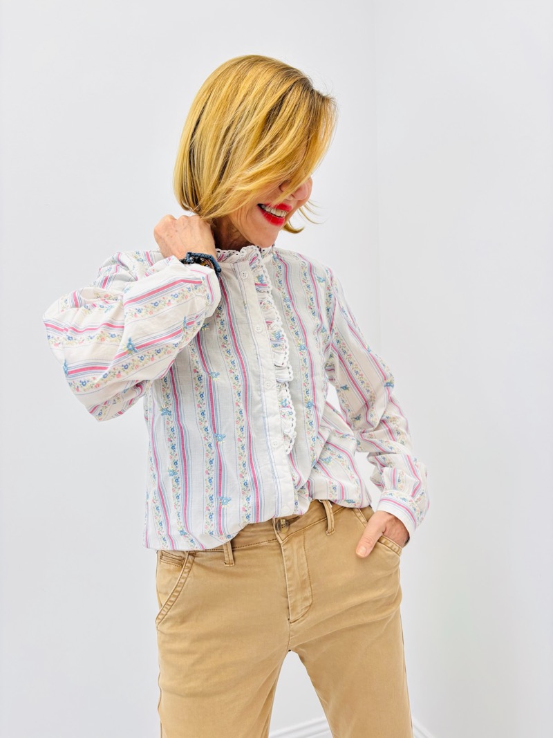 Les manches longues, légèrement bouffantes, se terminent par des poignets boutonnés, apportant une note chic et structurée. Le jeu de rayures verticales allonge visuellement la silhouette, tandis que les motifs floraux discrets ajoutent de la personnalité sans alourdir l’ensemble.